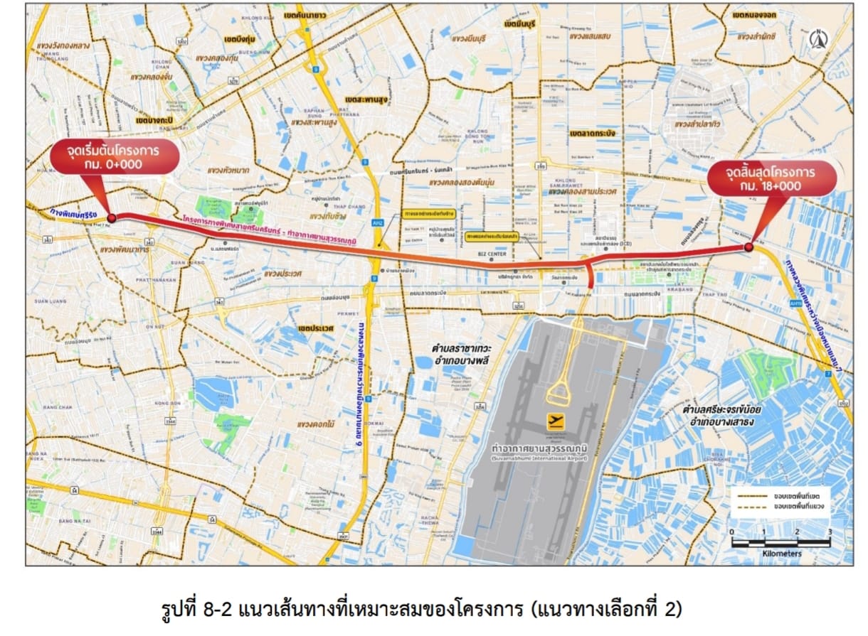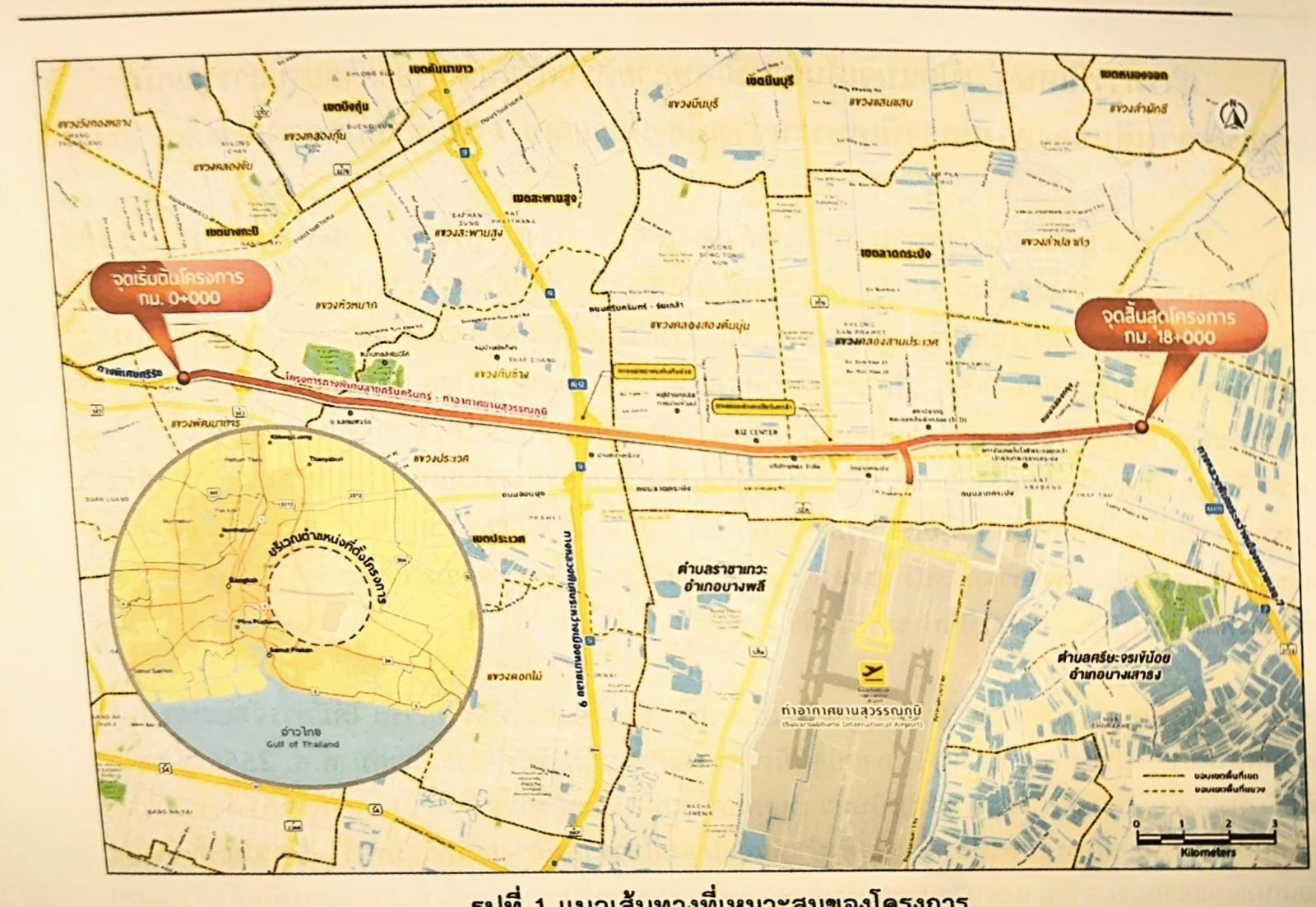 รูปที่ 1 แนวเส้นทางที่เหมาะสมของโครงการการศึกษาและคัดเลือกรูปแบบทางเลือกที่เหมาะสมของโครงการ ประกอบด้วย ตำแหน่งทางยกระดับของโครงการที่เหมาะสม ได้แก่ รูปแบบที่ 1 ทิศใต้ของทางหลวงพิเศษระหว่างเมืองหมายเลข 7 (ขวาทาง) ทางยกระดับมีจุดเริ่มต้น ต่อจากจุดสิ้นสุดของทางพิเศษศรีรัช (ส่วน D) บริเวณเกาะแบ่ง ระหว่างทางหลวงพิเศษและทางบริการ ของทั้ง 2 ทิศทาง ทิศทางละ 2 ช่องจราจร และจะวิ่งผ่านทางต่างระดับศรีนครินทร์ จากนั้นทางยกระดับด้านเหนือจะเบี่ยงแนว ลงมารวมกับด้านทิศใต้เป็น ถนนขนาด 4 ช่องจราจร (ไป - กลับ) ระยะทางประมาณ 10 กม. ผ่านจุดตัดทางหลวงพิเศษระหว่างเมืองหมายเลข 9 และจะแยกออกเป็นสองฝั่ง ฝั่งละ 2 ช่องจราจร ต่อทิศทางเช่นเดิม และจะวิ่งผ่านทางต่างระดับร่มเกล้า ผ่านทางแยกต่างระดับสุวรรณภูมิ โดยบริเวณนี้โครงสร้างจะมีทางแยกออก เพื่อเชื่อมต่อทางต่างระดับท่าอากาศยานสุวรรณภูมิทั้งขาเข้าและขาออก จากนั้นแนวเส้นทางหลักจะมุ่งหน้าไปทางทิศตะวันออกตามทางหลวงพิเศษระหว่างเมืองหมายเลข 7 และลดระดับลงเป็นถนนระดับดินที่จุดสิ้นสุดโครงการ ดังรูปที่ 2