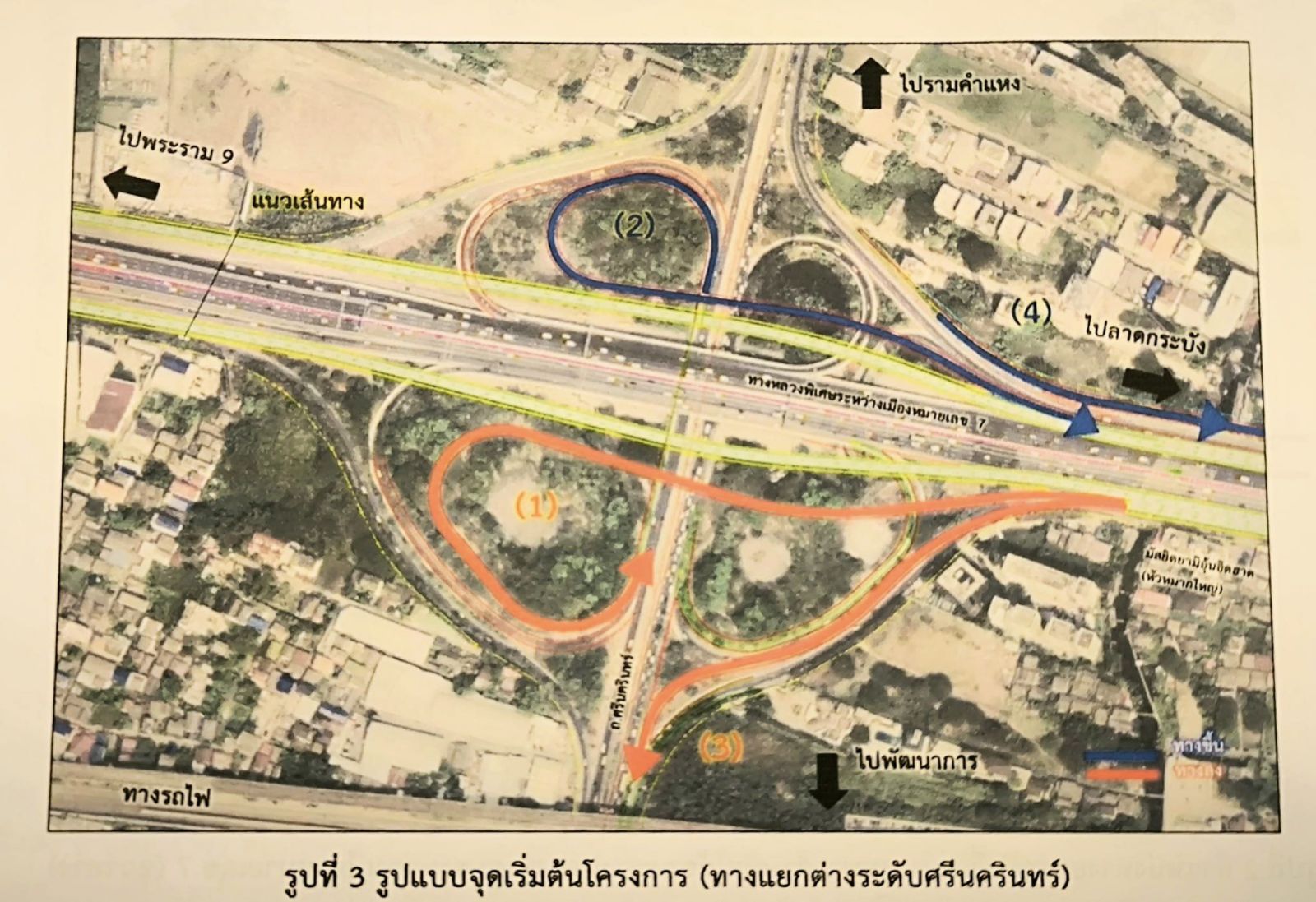 รูปที่ 2 ตำแหน่งทางยกระดับที่เหมาะสมทางด้านทิศใต้ของทางหลวงพิเศษระหว่างเมืองหมายเลข 7 (ขวาทาง) รูปแบบจุดเริ่มต้นโครงการ (ทางแยกต่างระดับศรีนครินทร์) เป็นรูปแบบมีลักษณะเป็น Partial Cloverleaf Interchange ประกอบด้วย ทางขึ้น-ลง 4 ทิศทาง ได้แก่ (ทิศทางที่ 1) ทางลง Loop Ramp (สีแดง) สำหรับรถที่มาจากลาดกระบังมุ่งหน้าไปรามคำแหง เพื่อเข้าเชื่อมถนนศรีนครินทร์ (ทิศทางที่ 2) ทางขึ้น Loop Ramp (สีน้ำเงิน) สำหรับรถที่มาจากพัฒนาการมุ่งหน้าไปลาดกระบัง เลี้ยวขวาเข้าเชื่อมทางพิเศษของโครงการในทิศขาออกเมือง (ทิศทางที่ 3) ทางลง Directional Ramp (สีแดง) สำหรับรถที่มาจากลาดกระบัง เลี้ยวซ้ายเข้าเชื่อมถนนศรีนครินทร์ (ทิศทางที่ 4) ทางขึ้น Directional Ramp (สีน้ำเงิน) สำหรับรถที่มาจากรามคำแหง มุ่งหน้าไปลาดกระบัง เลี้ยวซ้ายเข้าเชื่อมทางพิเศษของโครงการ ในทิศขาออกเมือง แสดงดังรูปที่ 3