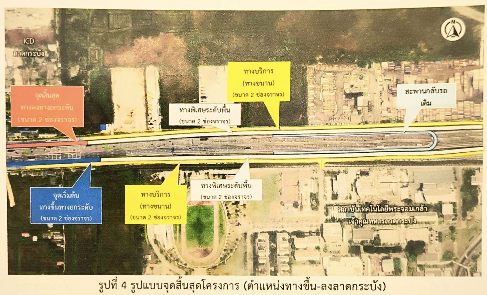 ก่อนสะพานกลับหน้าสถาบันเทคโนโลยีพระจอมเกล้าเจ้าคุณทหารลาดกระบัง (สจล.) ในปัจจุบัน ทั้ง 2 ฝั่ง โดยที่ ทางขึ้น ออกแบบเป็นทางขนาด 2 ช่องจราจรแยกจากทางหลักของทางหลวงพิเศษระหว่างเมืองหมายเลข 7 อ้อมด้านข้างของสะพานกลับรถในปัจจุบัน ก่อนจะยกระดับเข้าสู่โครงการ ทางลง ออกแบบทางลงขนาด 2 ช่องจราจร อ้อมด้านข้างของสะพานกลับรถในปัจจุบันเข้าเชื่อมทางหลักของทางหลวงพิเศษระหว่างเมืองหมายเลข 7 แสดงดังรูปที่ 4