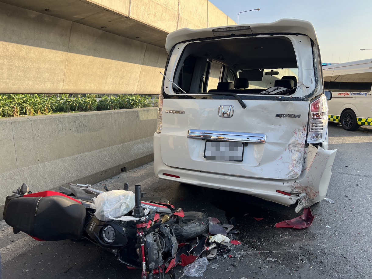 ที่เกิดเหตุ ทีมกู้ชีพและกู้ภัยกำลังพยายามช่วยยื้อชีวิตด้วยการปั๊มหัวใจ นายเอ (นามสมมุติ) อายุ 47 ปี หลังจาก ขับขี่รถจักรยานยนต์ ยี่ห้อ ฮอนด้า รุ่น MSX สีแดง ทะเบียน กทม ชนท้ายรถยนต์อเนกประสงค์ ยี่ห้อ ฮอนด้า ทะเบียน กทม. ทางกู้ชีพปั๊มหัวใจนานกว่า 30 นาที ไม่เป็นผล เสียชีวิตในเวลาต่อมา