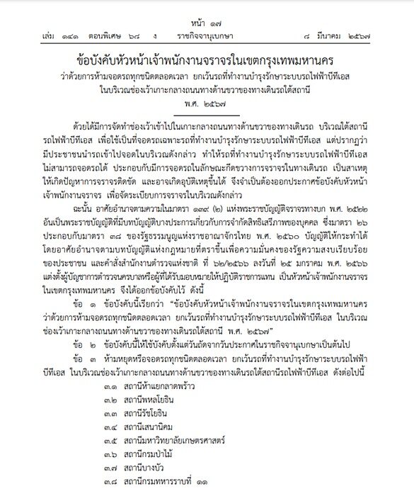 วันที่ 10 มี.ค.2567 ผู้สื่อข่าวรายงานว่า เว็บไซต์ ราชกิจจานุเบกษา เผยแพร่ข้อบังคับหัวหน้าเจ้าพนักงานจราจรในเขตกรุงเทพมหานคร ว่าด้วยการห้ามจอดรถทุกชนิดตลอดเวลา ยกเว้นรถที่ทํางานบํารุงรักษาระบบรถไฟฟ้าบีทีเอสในบริเวณช่องเว้าเกาะกลางถนนทางด้านขวาของทางเดินรถใต้สถานี พ.ศ. 2567