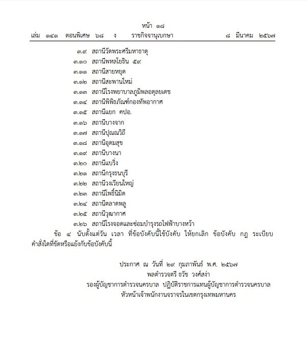 ประกาศ ณ วันที่ 29 กุมภาพันธ์ พ.ศ. 2567 พล.ต.ต.ธวัช วงศ์สง่า รองผู้บัญชาการตํารวจนครบาล ปฏิบัติราชการแทนผู้บัญชาการตํารวจนครบาล หัวหน้าเจ้าพนักงานจราจรในเขตกรุงเทพมหานคร
