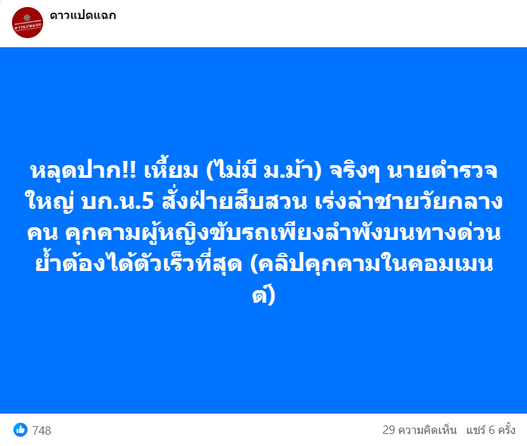 ล่าสุดวันนี้ (11 มีนาคม 2567) เพจข่าว "ดาวแปดแฉก" ก็ได้โพสต์ข้อความว่า หลุดปาก!! เหี้ยม (ไม่มี ม.ม้า) จริงๆ นายตำรวจใหญ่ บก.น.5 สั่งฝ่ายสืบสวน เร่งล่าชายวัยกลางคน คุกคามผู้หญิงขับรถเพียงลำพังบนทางด่วน ย้ำต้องได้ตัวเร็วที่สุด