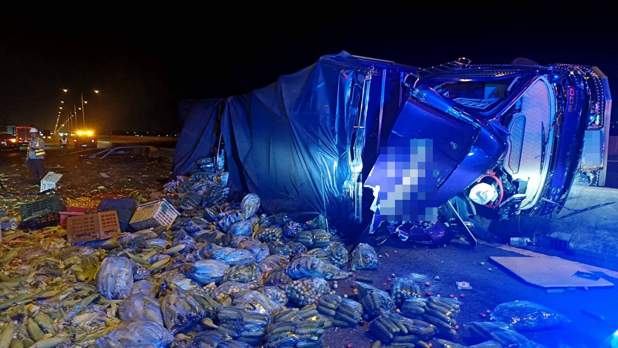 รถบรรทุกผัก เสียหลักพลิกตะแคง บนทางด่วนบูรพาวิถี กม.27 มีผู้เสียชีวิต 2 คน