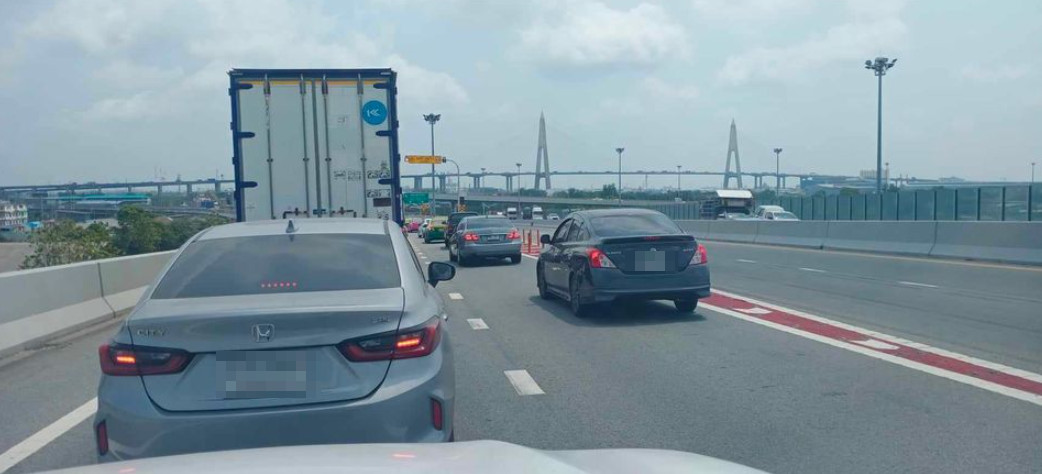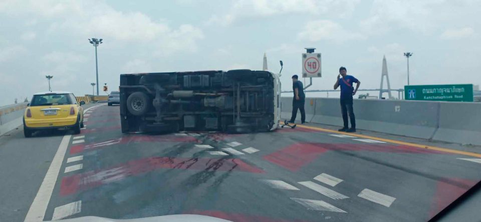 เชิงทางลงสะพานภูมิพล 2 ขาออก ก่อนถึงทางโค้งวนลงถนนปู่เจ้าฯ รถบรรทุกเสียหลักพลิกตะแคง รถผ่านได้เฉพาะไหบ่ทางซ้ายเท่านั้น การจราจรติดขัดมาก #รายงานจราจร #รถติด #อุบัติเหตุ #FM91
