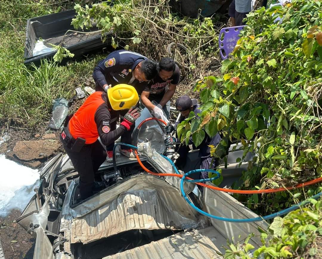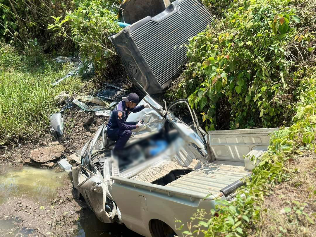 คุณลุงวัย 60 ขับรถกระบะบรรทุกน้ำยางพาราสด เสียหลักพลิกลงข้างทาง เสียชีวิตในซากรถ ริมถนนเพชรเกษม จ.พัทลุง