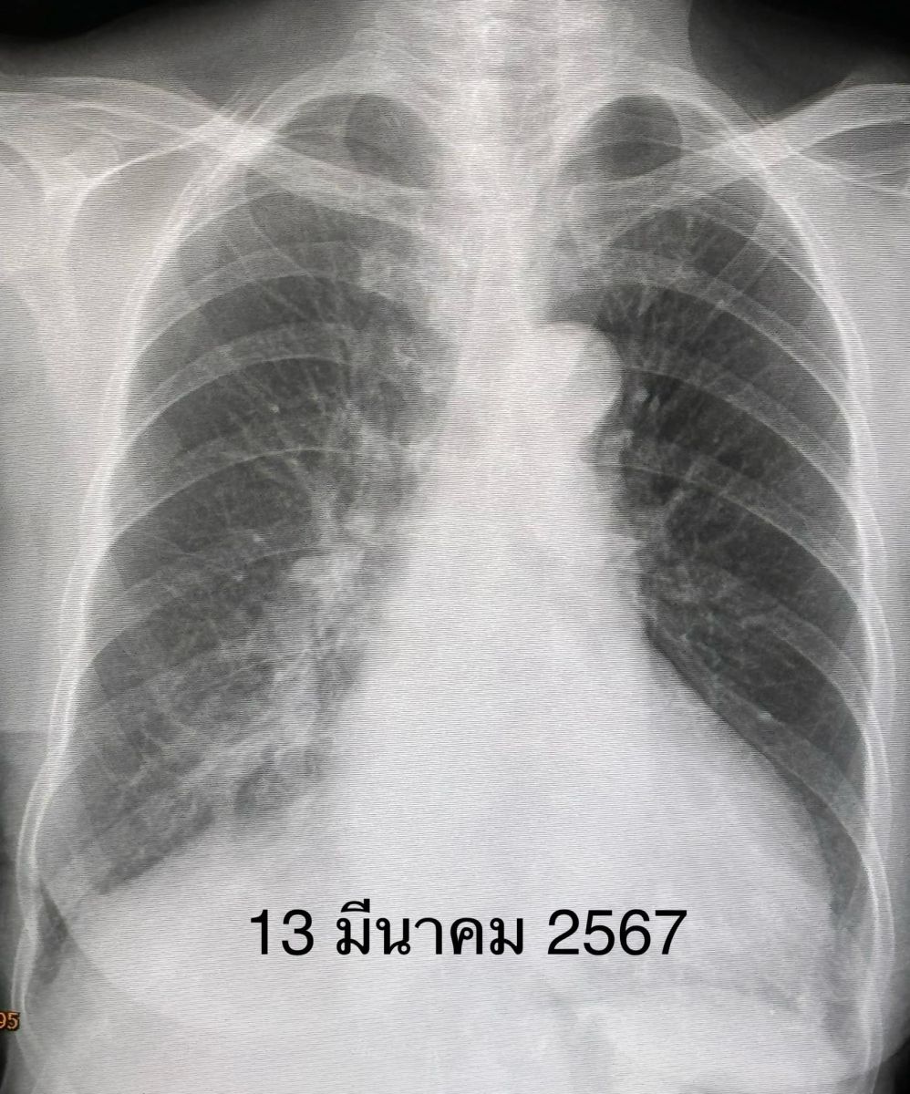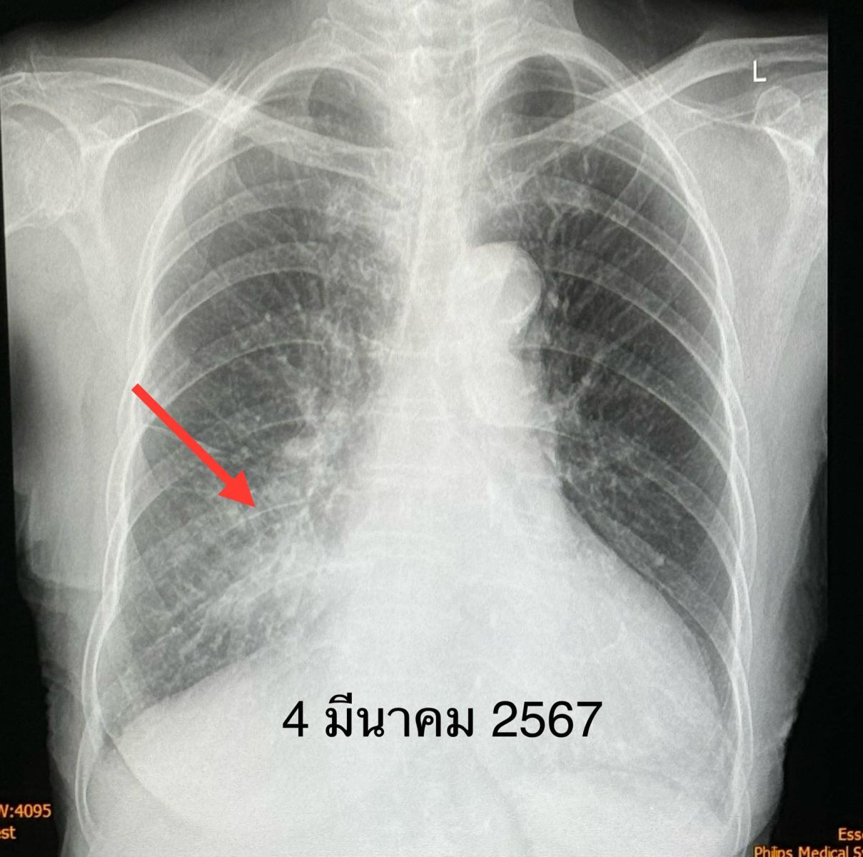 ตรวจร่างกาย อุณหภูมิ 38 องศาเซลเซียส ระดับออกซิเจนปกติ 96% ฟังปอดปกติ ส่งตรวจรหัสพันธุกรรม 22 สายพันธุ์ พบเชื้อไรโนไวรัส (Rhinovirus) เพียงตัวเดียวเอกซเรย์ปอดพบฝ้าขาวที่ปอดด้านขวาล่าง (รูปวันที่ 4 มี.ค.2567) เจาะเลือด เม็ดเลือดขาวปกติ ส่งเพาะเชื้อในเลือดไม่ขึ้นเชื้อแบคทีเรีย