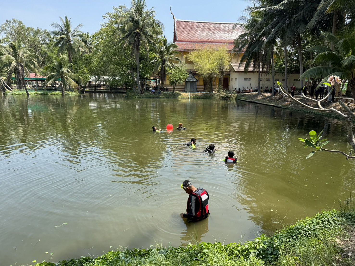 ที่เกิดเหตุ พบหลวงพ่อและชาวบ้าน แจ้งข้อมูลว่า มีบุคคลที่พักอาศัยอยู่ในวัดได้หายตัวไปตั้งแต่เมื่อคืน และช่วงเช้ามาพบรองเท้าลอยอยู่ในสระน้ำ คาดว่าน่าจะพลัดตกน้ำไป จึงประสานทีมกู้ภัยสว่างสรรเพชญ นำทีมประดาน้ำมาทำการค้นหา