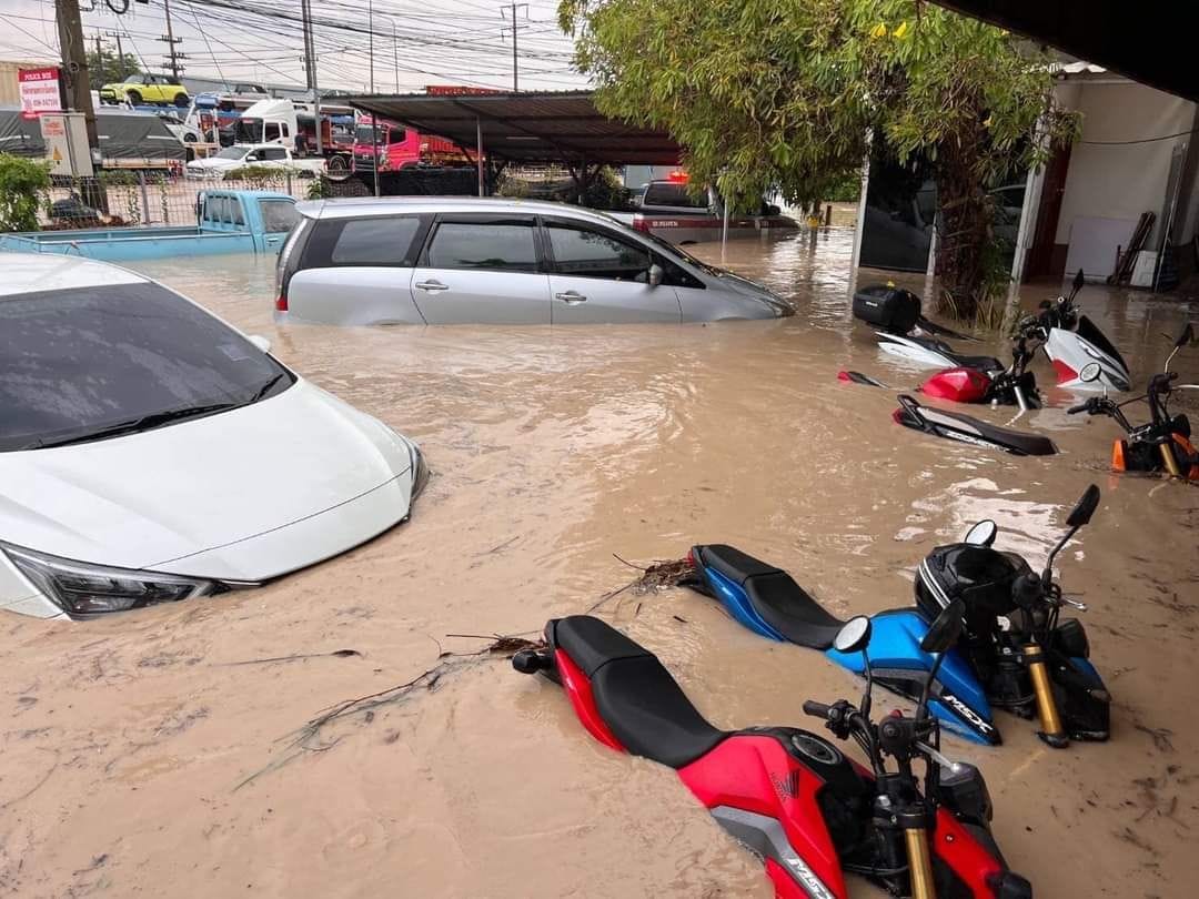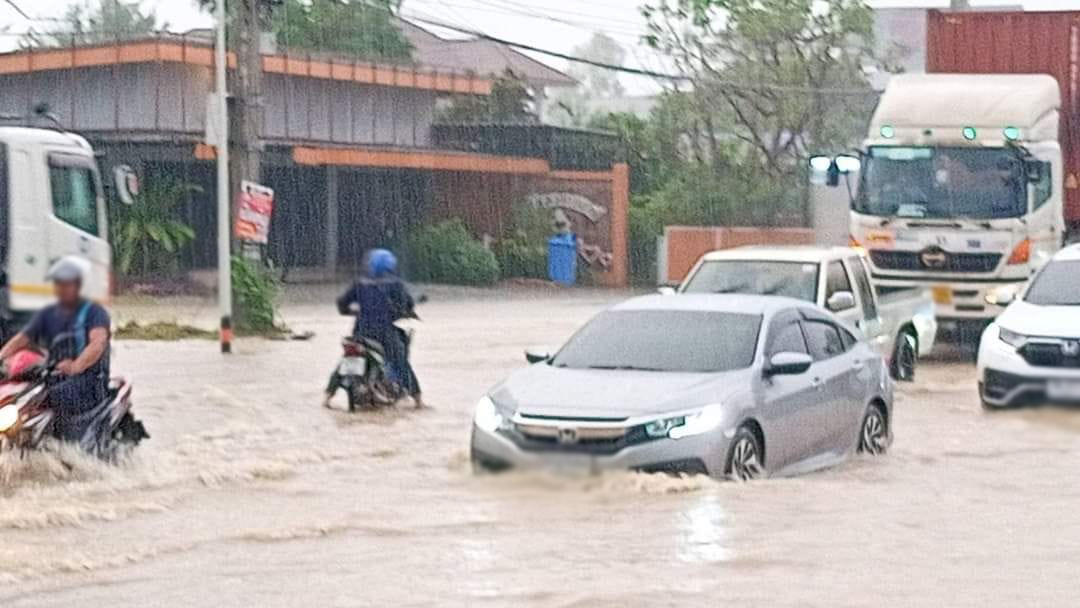 ฝนถล่มศรีราชา น้ำท่วมขังหลายจุด ในขณะพื้นที่ต่ำ รถจมเกือบมิดคัน จ.ชลบุรี