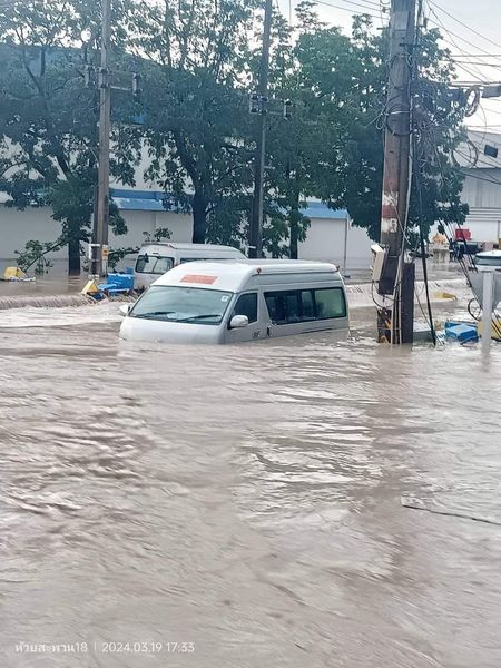 เมื่อเวลา 18.00 น. วันที่ 19 มีนาคม 2567 ผู้สื่อข่าวรายงานว่า ภายหลังจากที่มีฝนตกลงมาติดต่อกันเป็นเวลา 1-2 ชั่วโมง ในพื้นที่ อ.ศรีราชา จ.ชลบุรี ส่งผลให้เกิดน้ำท่วมขังหลายจุดในพื้นที่