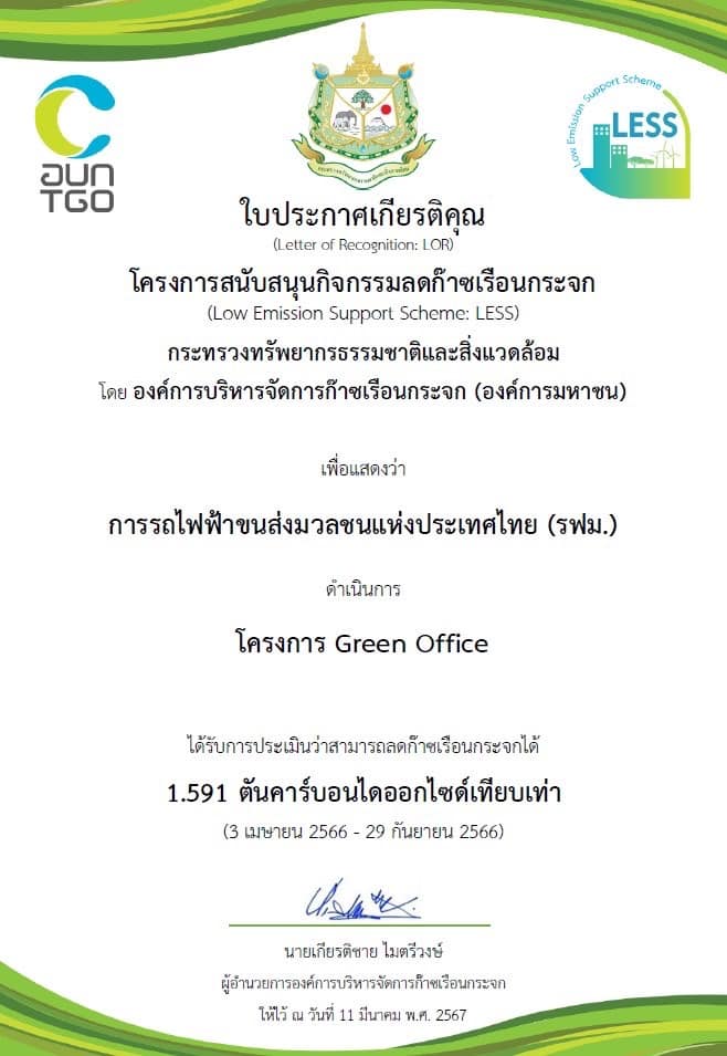 Green Office รฟม. คว้าใบประกาศเกียรติคุณ “โครงการสนับสนุนกิจกรรมลดก๊าซเรือนกระจก” ต่อเนื่องเป็นปีที่ 4 ช่วยลดก๊าซเรือนกระจกได้ 1,543.48 กิโลกรัม คิดเป็น 1.591 ตันคาร์บอนไดออกไซต์เทียบเท่า