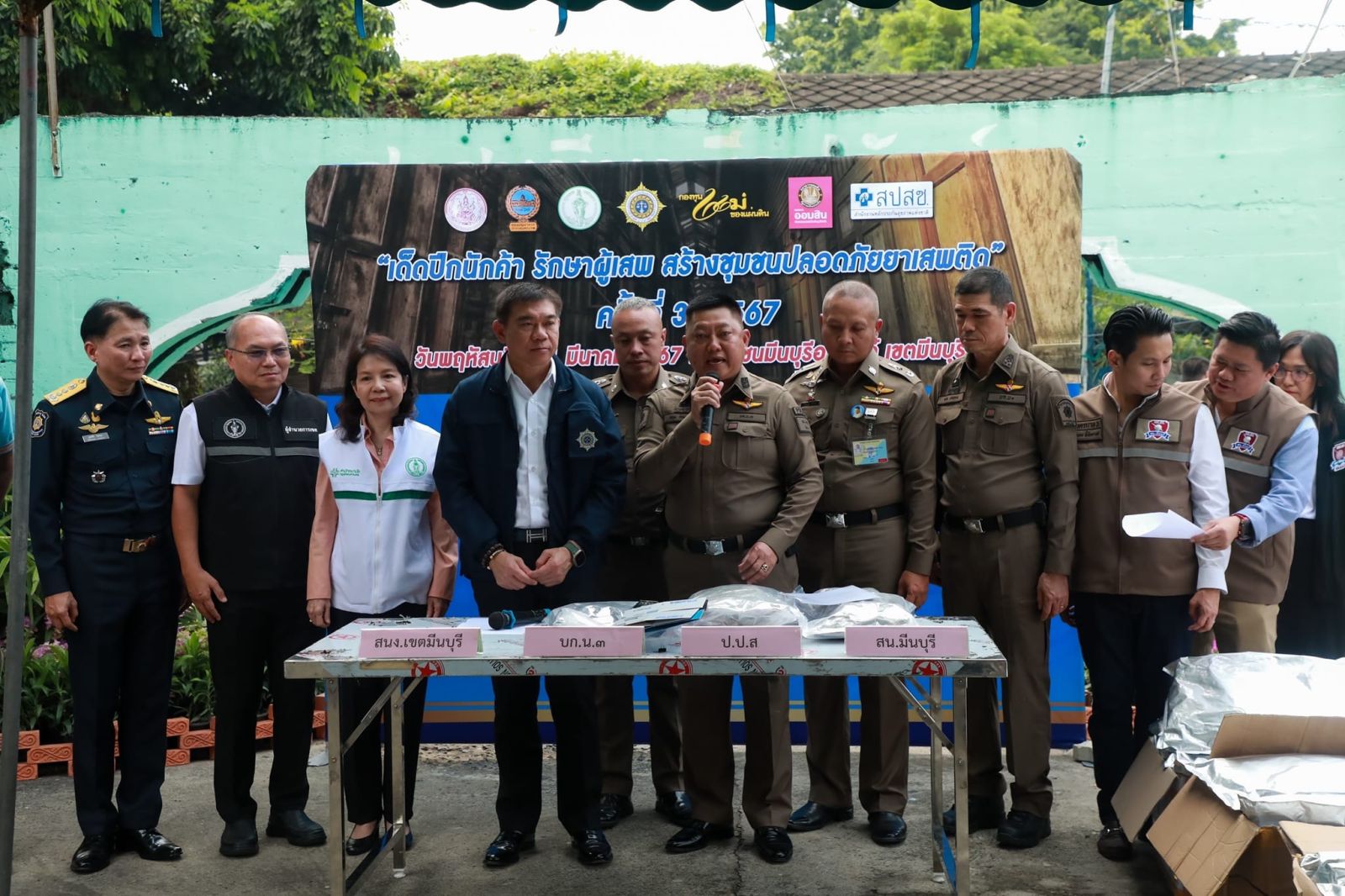 วันพฤหัสบดีที่ 21 มีนาคม 2567 พล.ต.ท.ภาณุรัตน์ หลักบุญ เลขาธิการ ป.ป.ส. พร้อม นายศักดิ์ชัย ใสสุข ผู้อำนวยการเขตมีนบุรีเปิดปฏิบัติการ “เด็ดปีกนักค้า รักษาผู้เสพ สร้างชุมชนปลอดภัยยาเสพติด”โดยปิดล้อมตรวจค้นชุมชนแพร่ระบาดยาเสพติด จำนวน 31 แห่ง เพื่อจับกุมผู้ค้ารายย่อย จำนวน 34 เป้าหมาย ในพื้นที่ 4 เขตคือ มีนบุรี หนองจอก ลาดกระบัง และคลองสามวา