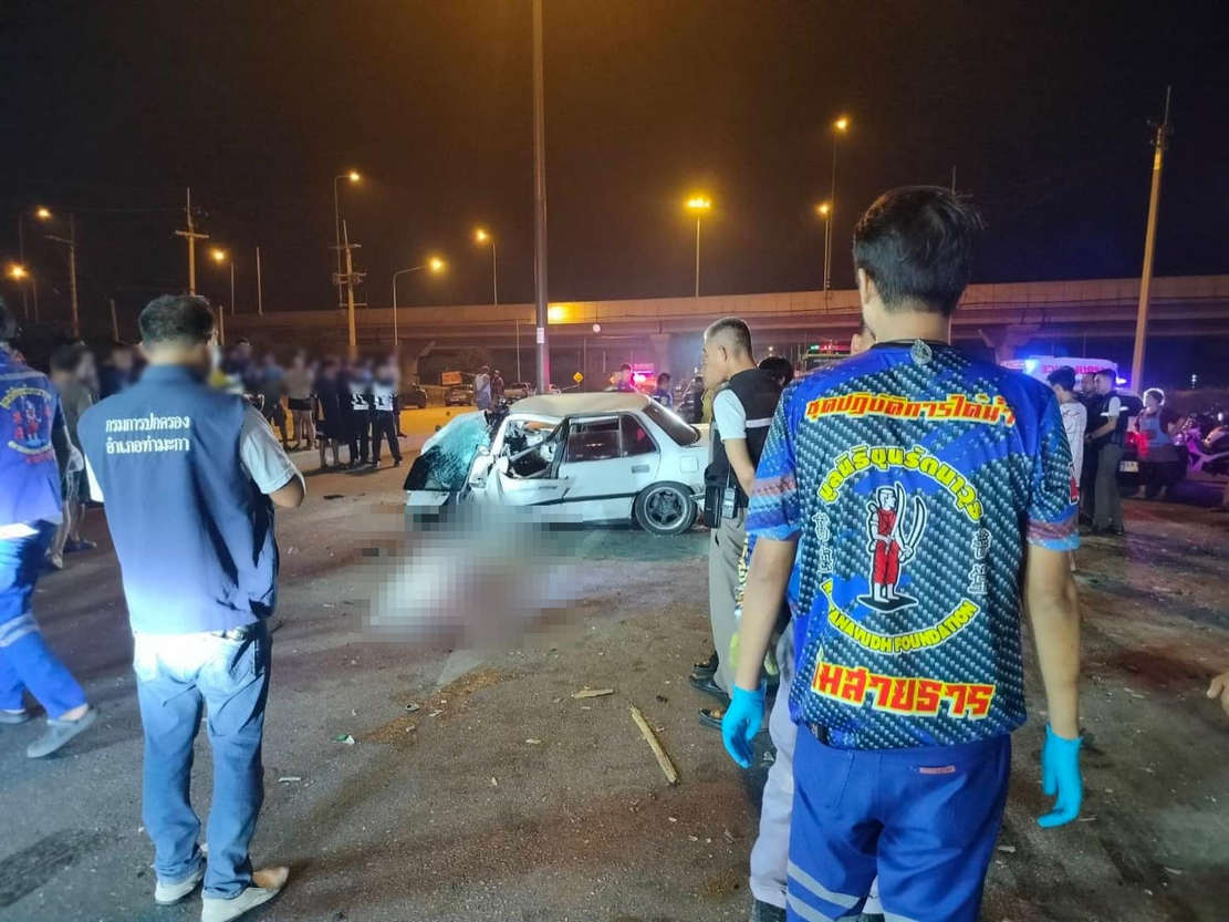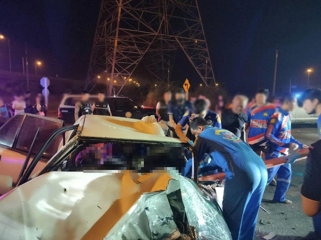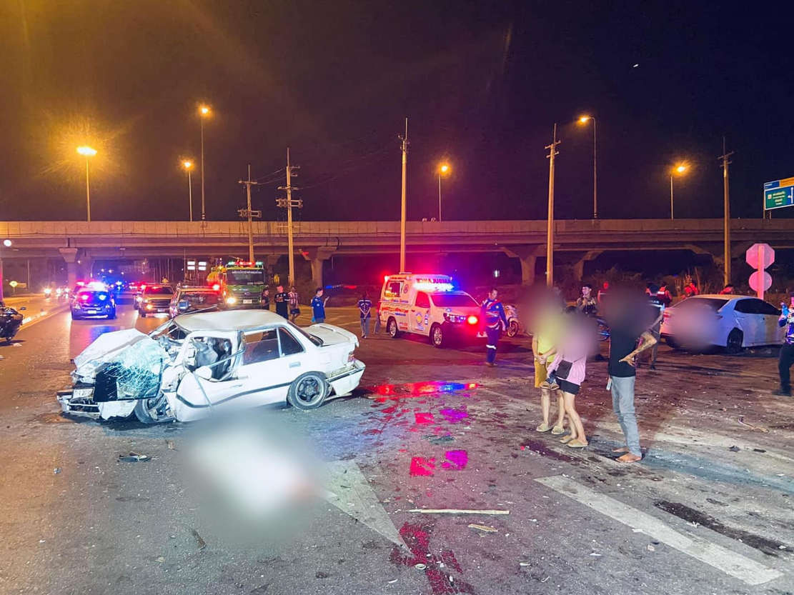 รถนั่งส่วนบุคคล 2 คันชนกันอย่างจัง กลางทางแยกตัดมอเตอร์เวย์ (M81) มีผู้บาดเจ็บ 6 รายและเสียชีวิต 1 คน จ.กาญจนบุรี