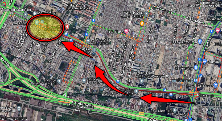 เวลา 22.30 น. วันที่ 22 มีนาคม 2567 ถนนดินแดง ฝั่งขาเข้ามุ่งหน้าแยกใต้ด่วนฯ ดินแดง เจ้าหน้าที่กำลังปฏิบัติงาน "เปิดบ่อร้อยสายไฟ" ฝั่งตรงข้ามโรงเรียนพิบูลประชาสรรค์ การจราจรผ่านได้ 1 เลน ปริมาณรถมาก รถติดท้ายสะสมบนสะพานข้ามแยก ช่วงเหนือแยกพระรามเก้า