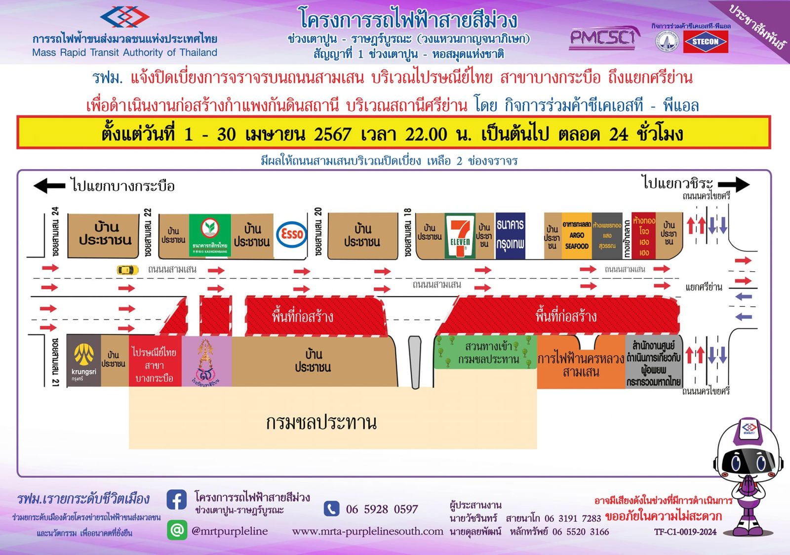 เพื่อดำเนินงานก่อสร้างกำแพงกันดินสถานี บริเวณสถานีศรีย่าน ตั้งแต่วันที่ 1 - 30 เมษายน 2567 เวลา 22.00 น. เป็นต้นไป ตลอด 24 ชั่วโมง มีผลให้ถนนสามเสนบริเวณปิดเบี่ยง สามารถสัญจรได้ 2 ช่องจราจร