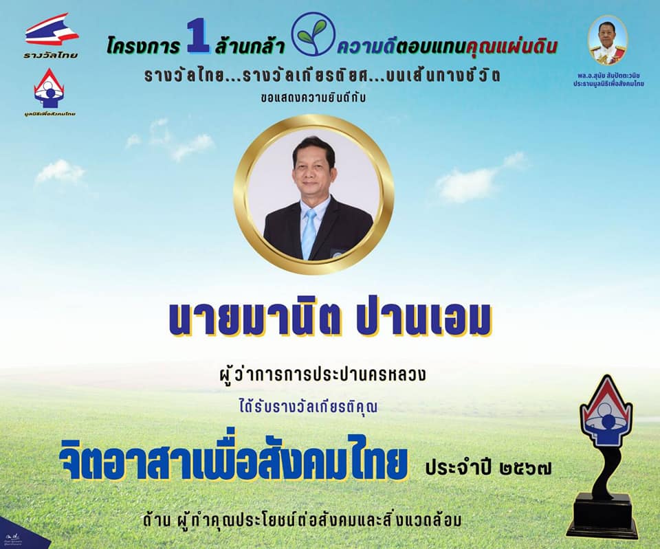 เมื่อวันที่ 22 มีนาคม พ.ศ. 2567 เวลา 13.00 น. ณ ห้องชัยพฤกษ์ 2 หอประชุมกองทัพอากาศ พลอากาศเอก ชลิต พุกผาสุข องคมนตรี เป็นประธานมอบรางวัลในโครงการ “หนึ่งล้านกล้าความดีตอบแทนคุณแผ่นดิน” จัดโดยมูลนิธิเพื่อสังคมไทย ซึ่งเป็นโครงการที่ส่งเสริมให้คนไทยประกอบคุณงามความดีกับตนเอง ครอบครัว สังคม และประเทศชาติ เพื่อให้เกิดประโยชน์สูงสุดต่อส่วนรวม โดย กปน. ได้รับรางวัลทั้งในประเภท “บุคคล” และ “องค์กร” ได้แก่ รางวัลเกียรติคุณ จิตอาสาเพื่อสังคมไทย ประจำปี 2567 ที่มอบให้แก่ นายมานิต ปานเอม ผู้ว่าการการประปานครหลวง (กปน.) และ รางวัลองค์กรดีเด่นแห่งปี ประจำปี 2567 ด้านองค์กรที่ทำคุณประโยชน์ต่อสังคมและสิ่งแวดล้อม ในการนี้ น.ส.วิชชุดา เลี่ยมสงวน รองผู้ว่าการ กปน. และ นางเมธาวี สุชาติล้ำพงศ์ ผู้ช่วยผู้ว่าการ กปน. เป็นผู้แทนเข้ารับรางวัลดังกล่าว
