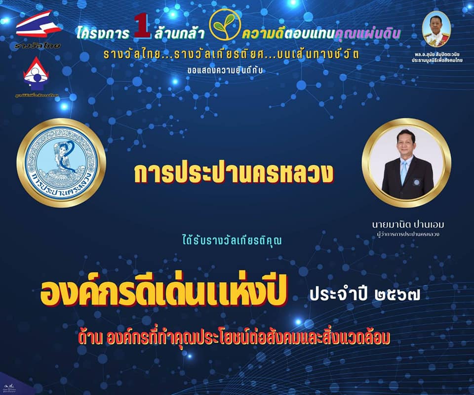 กปน. คว้ารางวัล “องค์กรดีเด่นแห่งปี” ประจำปี 2567 ด้านองค์กรที่ทำคุณประโยชน์ต่อสังคมและสิ่งแวดล้อม และ ผู้ว่าการ กปน. ได้รับรางวัลเกียรติคุณ “จิตอาสาเพื่อสังคมไทย” ประจำปี 2567