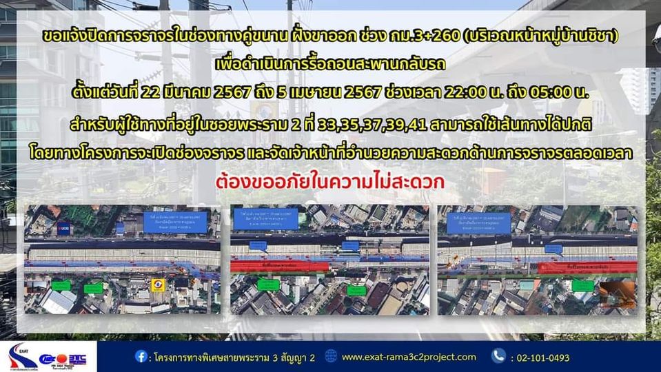 การทางพิเศษเเห่งประเทศไทย(กทพ.) โครงการทางพิเศษสายพระราม3 สัญญา 2 ขอแจ้งปิดการจราจรในช่องทางคู่ขนาน บนถนนพระราม 2 ฝั่งขาออก มุ่งหน้าสมุทรสาครชั่วคราว เพื่อดำเนินการรื้อถอนสะพานกลับรถตัวเดิม (หมู่บ้านชิชา) ขอปิดการจราจรในช่องทางคู่ขนาน ฝั่งขาออก (บริเวณหน้าหมู่บ้านชิชา) โดยผู้ใช้ทางสามารถใช้ช่องทางเบี่ยงเข้าทางหลักบริเวณตรงหน้าปั๊มซัสโก้ เพื่อไปออกทางคู่ขนานบริเวณคลองบัวได้ ตั้งแต่วันที่ 22 มีนาคม 2567 ถึง 5 เมษายน 2567 ช่วงเวลา 22:00 น. ถึง 05:00 น.