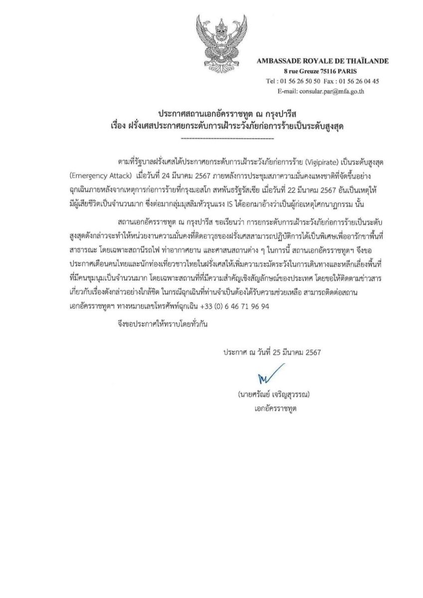 วันนี้ (27 มี.ค. 67) สถานเอกอัครราชทูต ณ กรุงปารีส ประกาศผ่านทางหน้าเพจเฟซบุ๊กเมื่อวันอังคาร (26 มี.ค.) โดยเตือนให้คนไทยและนักท่องเที่ยวชาวไทยในฝรั่งเศสเพิ่มความระมัดระวังในการเดินทางและหลีกเลี่ยงพื้นที่ที่มีคนชุมนุมเป็นจำนวนมาก หลังจากรัฐบาลฝรั่งเศสได้ประกาศยกระดับการเฝ้าระวังภัยการก่อการร้ายเป็นระดับสูงสุด ภายหลังเกิดเหตุก่อการร้ายที่กรุงมอสโกประเทศรัสเซียเมื่อสัปดาห์ที่ผ่านมา โดยการยกระดับการเฝ้าระวังภัยดังกล่าวจะทำให้หน่วยงานความมั่นคงติดอาวุธของฝรั่งเศสสามารถปฏิบัติการอารักขาพื้นที่สาธารณะ โดยเฉพาะสถานีรถไฟ ท่าอากาศยาน และศาสนสถานต่าง ๆ