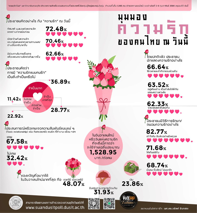 ‘สวนดุสิตโพล’ ร่วมกับหลักสูตรจิตวิทยาอุตสาหกรรม และองค์กร คณะมนุษยศาสตร์และสังคมศาสตร์ มหาวิทยาลัยสวนดุสิต ทำการศึกษาในหัวข้อ “มุมมองความรักของคนไทย ณ วันนี้” โดยเก็บรวบรวมข้อมูลด้วยวิธีการแบบผสมผสานระหว่างการสำรวจข้อมูลทางออนไลน์ และการเสวนากลุ่ม ซึ่งผลการสำรวจทางออนไลน์ สำรวจความคิดเห็นของประชาชนทั่วประเทศทั้งในกลุ่มผู้ใหญ่ และกลุ่มวัยรุ่น จำนวนทั้งสิ้น 1,095 คนระหว่างวันที่ 5-9 กุมภาพันธ์ 2566 พบว่า ปัจจุบันคนไทยมีทัศนคติ มุมมองต่อความรักแตกต่างจากสมัยก่อนถึงร้อยละ 72.48