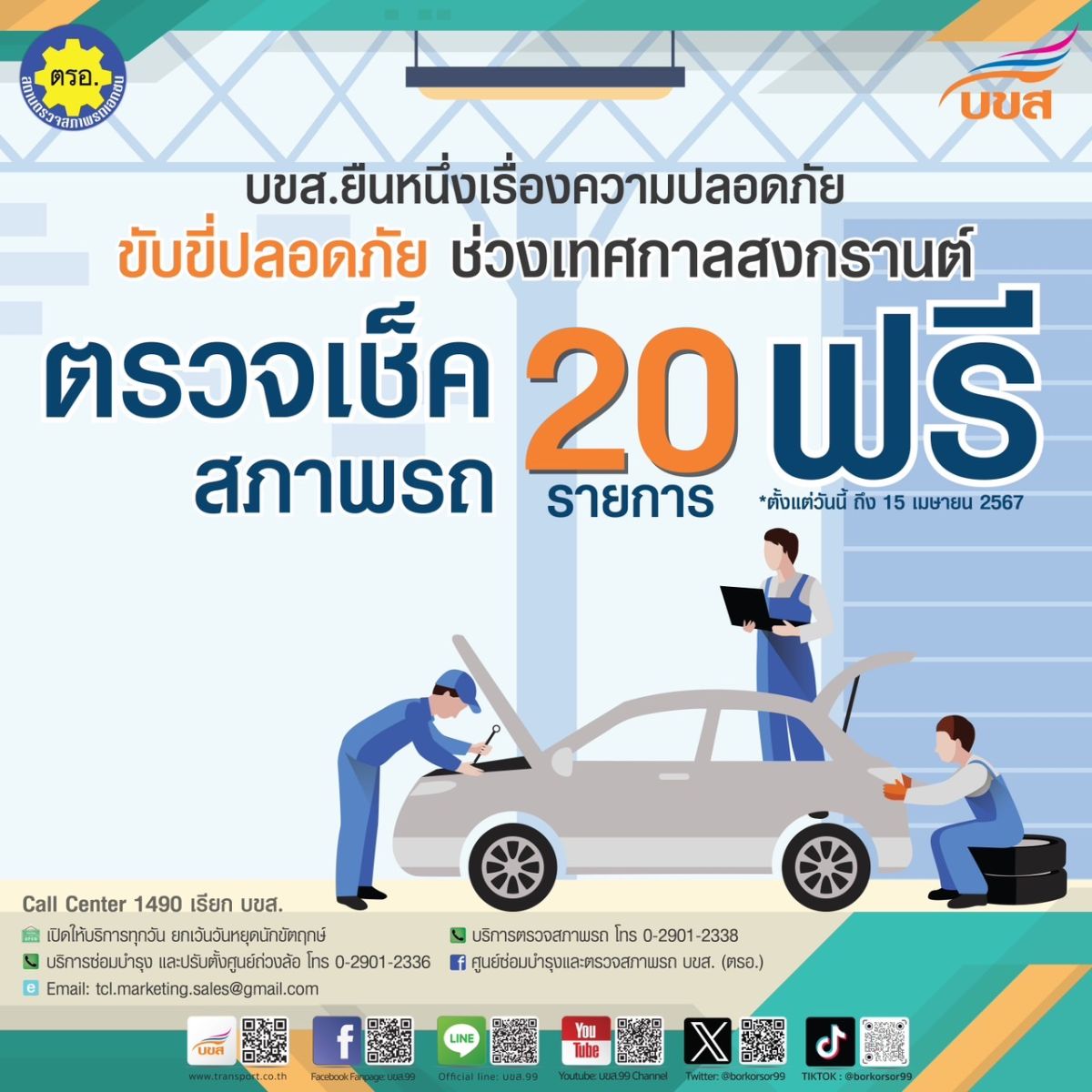 “สงกรานต์นี้ เดินทางกลับบ้านปลอดภัย” บขส. จัดให้ ตรวจรถฟรี 20 รายการ ที่ศูนย์ซ่อมบำรุงและตรวจสภาพรถ (รังสิต) ตั้งแต่วันนี้ – 15 เมษายน 2567