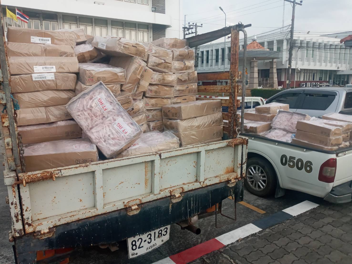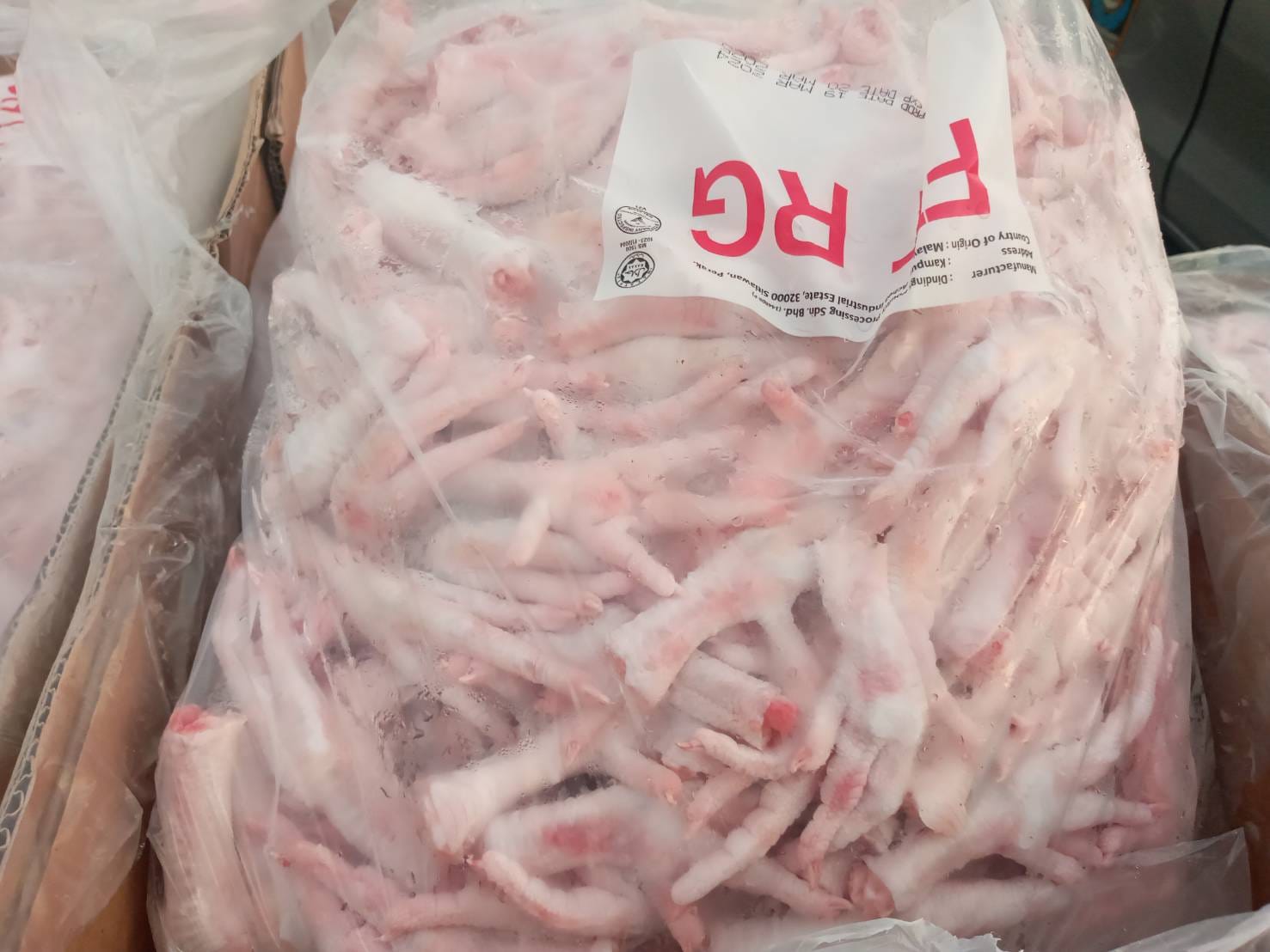 ตรวจยึดของกลาง ตีนไก่แช่แข็ง จำนวน 5,664 กิโลกรัม, ตีนไก่ถอดกระดูก (เล็บมือนาง) 565 กิโลกรัม รวม 6,229 กิโลกรัม มูลค่าประมาณ 600,000 บาท
