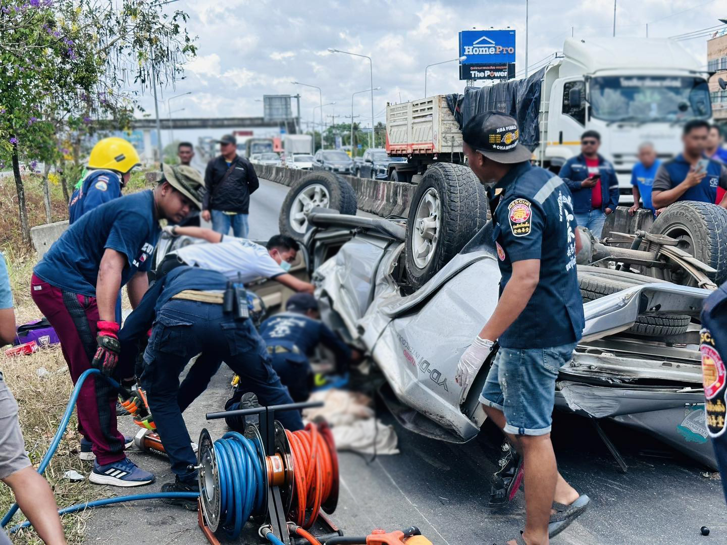 รถกระบะ เฉี่ยวชนกับรถพ่วงก่อนชนแบริเออร์ รถพลิกหงายท้องกลางถนนสายเอเชีย ขาล่องใต้ เสียชีวิต 2 ราย จ.พัทลุง