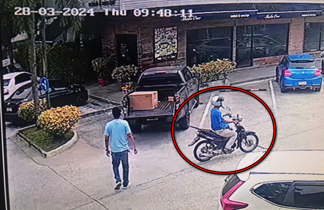 ภาพจากกล้องวงจรปิดในที่เกิดเหตุ วันที่ 28 มี.ค.67 เวลา 10.00 น. นายโอ ผู้ก่อเหตุ สวมเสื้อยืดสีฟ้า สวมกางเกงสีเขา สวมหมวกกันน็อกแบบเปิดหน้า ทำทีมาดูรถจยย.ฮอนด้า เวฟ สีน้ำเงิน ที่เจ้าของจอดไว้โดยเสียบกุญแจคาไว้ พอสบโอกาสได้ขึ้นขับรถ จยย.หลบหนีไป