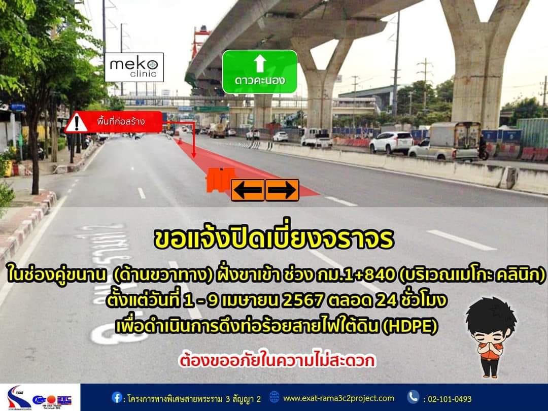 เพื่อดำเนินการดึงท่อร้อยสายไฟใต้ดิน (HDPE) โดยจะปิดเบี่ยงในช่องทางคู่ขนาน (ด้านขวาทาง) ฝั่งขาเข้า ช่วง กม.1+840 (บริเวณเมโกะ คลินิก) ตั้งแต่วันที่ 1 ถึง 9 เมษายน 2567 ตลอด 24 ชั่วโมง