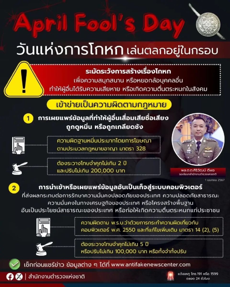 1 เมษายน 2567 สืบเนื่องจาก วันที่ 1 เมษายน ตรงกับวัน April Fool’s Day หรือ วันแห่งการโกหก ซึ่งมักจะมีการสร้างเรื่องโกหกเพื่อความสนุกสนาน หรือเพื่อหยอกล้อซึ่งกันและกันในหมู่เพื่อนฝูง แต่บางครั้งการล้อเล่นหรือการโกหก อาจส่งผลกระทบต่อผู้อื่น หรืออาจสร้างความตื่นตระหนกในสังคมได้เช่นเดียวกัน โดยเฉพาะการโพสต์เรื่องโกหกผ่านสื่อสังคมออนไลน์ ซึ่งอาจมีการเผยแพร่ ส่งต่อ หรือแชร์ ทำให้เรื่องโกหกกระจายไปในวงกว้าง