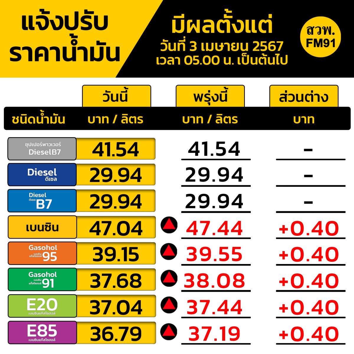 โดยน้ำมันในกลุ่มเบนซิน ปรับขึ้นราคา 40 สตางค์ต่อลิตร