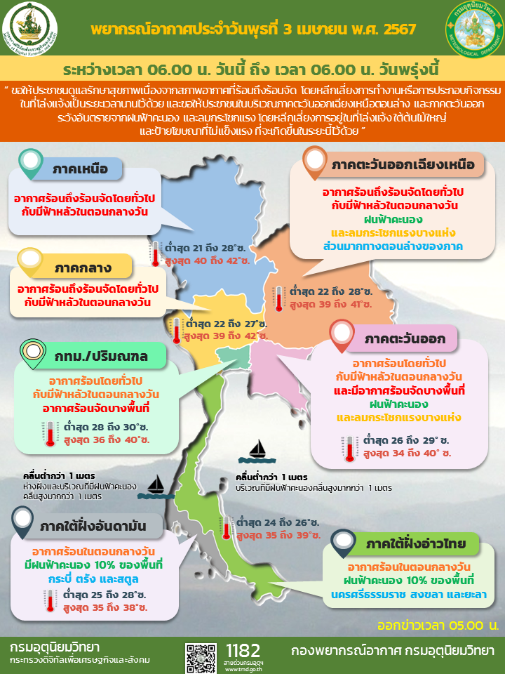 ลักษณะอากาศทั่วไป วันที่ 3 เมษายน 2567 พยากรณ์อากาศ 24 ชั่วโมงข้างหน้า ความกดอากาศต่ำเนื่องจากความร้อนปกคลุมประเทศไทยตอนบน ลักษณะเช่นนี้ทำให้ประเทศไทยมีอากาศร้อนถึงร้อนจัดโดยทั่วไปกับมีฟ้าหลัวในตอนกลางวัน ขอให้ประชาชนดูแลรักษาสุขภาพเนื่องจากสภาพอากาศที่ร้อนถึงร้อนจัด โดยหลีกเลี่ยงการทำงานหรือการประกอบกิจกรรมในที่โล่งแจ้งเป็นระยะเวลานานไว้ด้วย