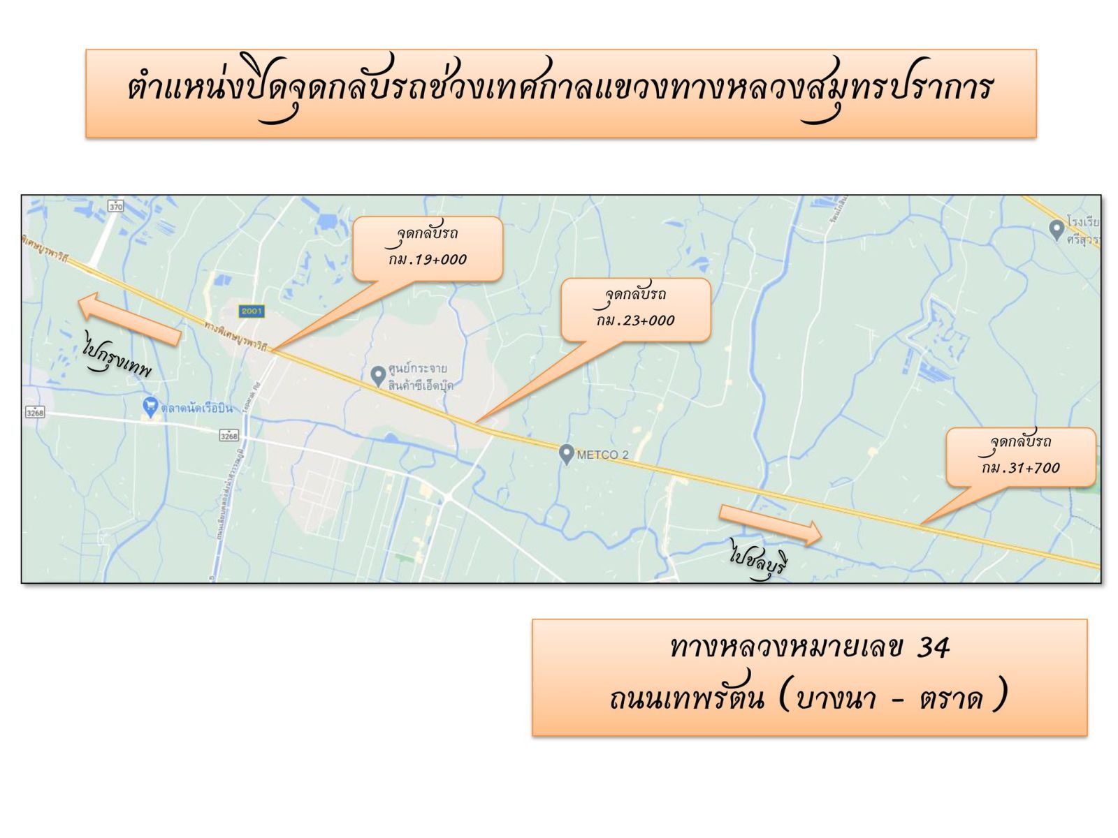 ขาเข้า: โดยให้ใช้สะพานกลับรถที่ กม.24+000 (จุดกลับรถบางพลีเมืองใหม่)