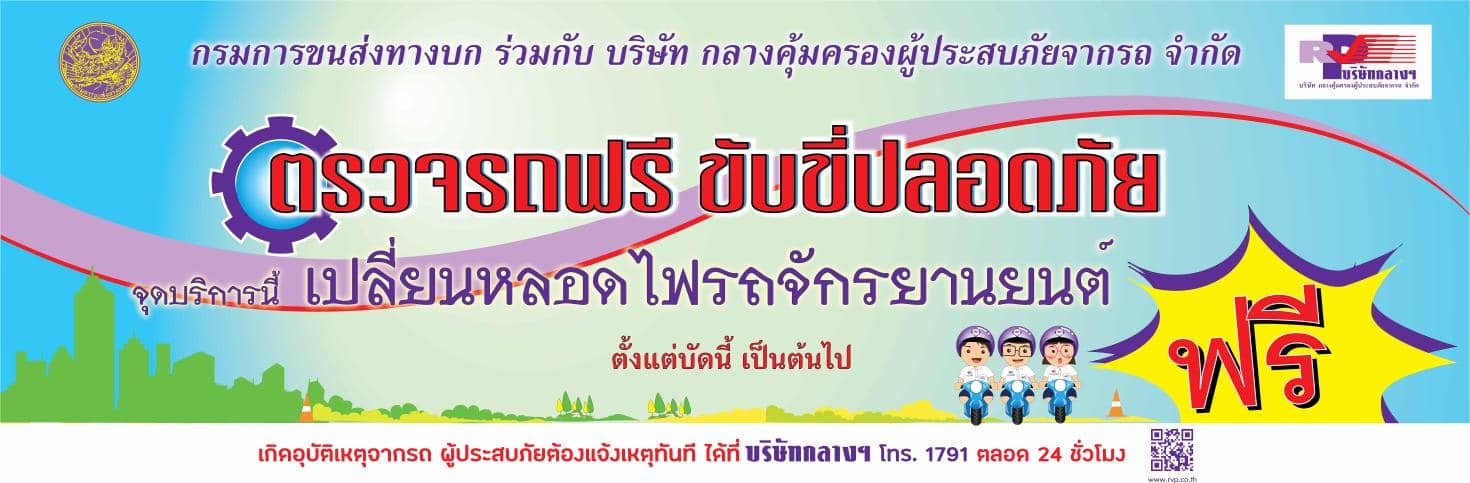 “ตรวจรถฟรี ขับขี่ปลอดภัย” บริษัทกลางฯ ร่วมกิจกรรม “ตรวจรถฟรี ขับขี่ปลอดภัย” กับกรมการขนส่งทางบก (ตั้งแต่วันที่ 1 - 15 เมษายน 2567) โดยทำกิจกรรมเพื่อรถจักรยานยนต์ปลอดภัย ให้บริการเปลี่ยนหลอดไฟรถจักรยานยนต์ ฟรี ทั้งไฟท้าย ไฟหน้า ไฟเลี้ยว ทั่วประเทศ จำนวน 202 จุดบริการ ที่ร้านจำหน่ายรถจักรยานยนต์,ตรอ.และวิทยาลัยเทคนิค ที่มีสัญลักษณ์ป้ายแบนเนอร์โครงการติดไว้ ทุกจังหวัดทั่วประเทศ (ประชาชนสามารถสอบถามรายละเอียดจุดบริการได้ที่บริษัท กลางคุ้มครองผู้ประสบภัยจากรถ จำกัด Call Center 1791 ตลอด 24 ชั่วโมง”