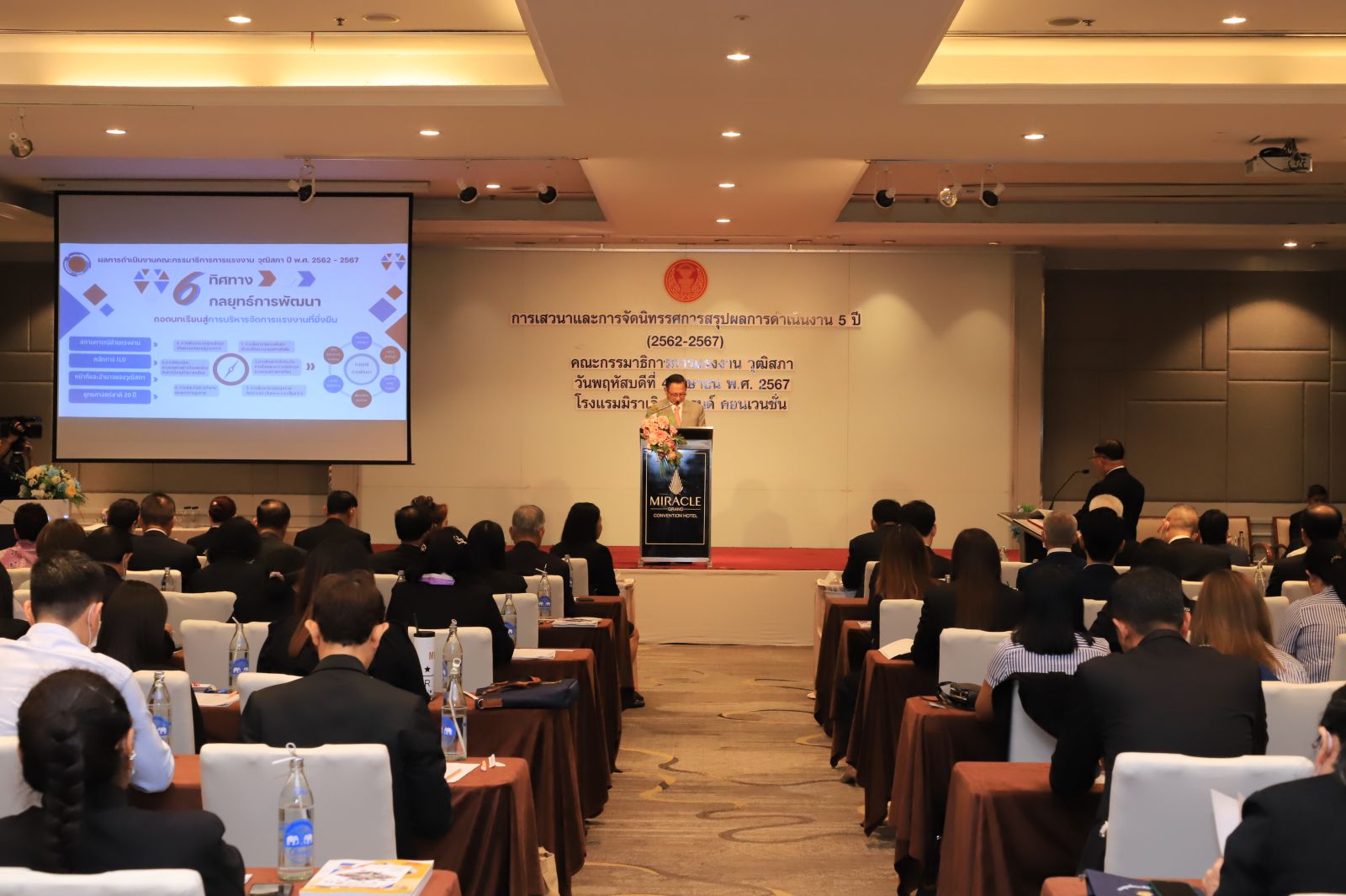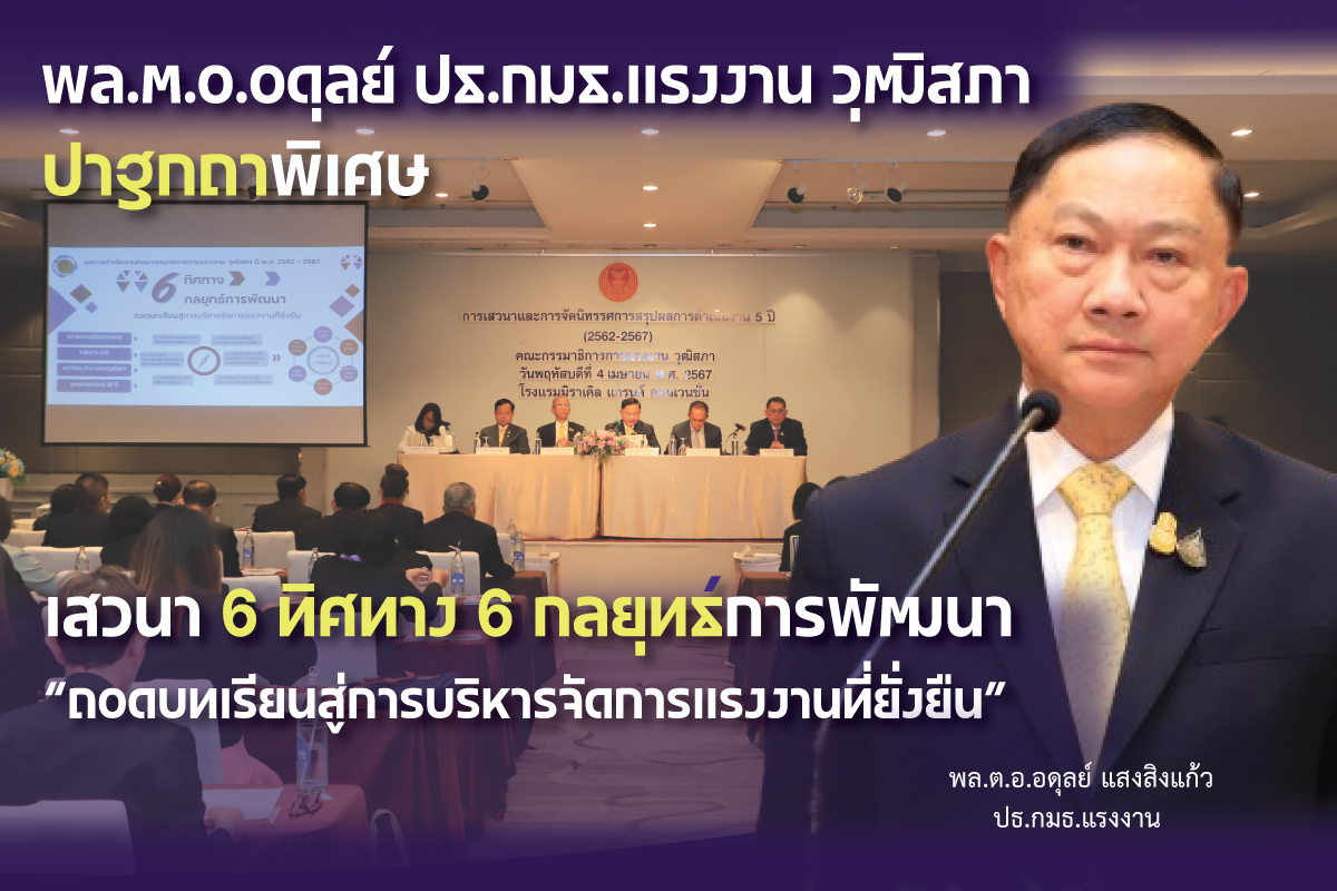 วันที่ 4 เมษายน 2567 พลตำรวจเอก อดุลย์ แสงสิงแก้ว ประธานคณะกรรมาธิการการแรงงาน วุฒิสภา กล่าวปาฐกถาพิเศษในหัวข้อ “ถอดบทเรียนสู่การบริหารจัดการแรงงานที่ยั่งยืน” พร้อมกล่าวรายงานวัตถุประสงค์การเสวนาและในงานเสวนาและการจัดนิทรรศการสรุปผลการดำเนินงาน “6 ทิศทาง 6 กลยุทธ์การพัฒนา ถอดบทเรียนสู่การบริหารจัดการแรงงานที่ยั่งยืน” ซึ่งจัดขึ้นโดย คณะกรรมาธิการการแรงงาน วุฒิสภา โดยมี นายศุภชัย สมเจริญรองประธานวุฒิสภา คนที่2เป็นประธานกล่าวเปิดงาน มีผู้แทนจากส่วนราชการและหน่วยงานของรัฐที่เกี่ยวข้องเข้าร่วมการสัมมนา ณ ห้องแมจิก 2 ชั้น 2 โรงแรมมิราเคิล แกรนด์ คอนเวนชั่น ถนนวิภาวดีรังสิต เขตหลักสี่ กรุงเทพมหานคร