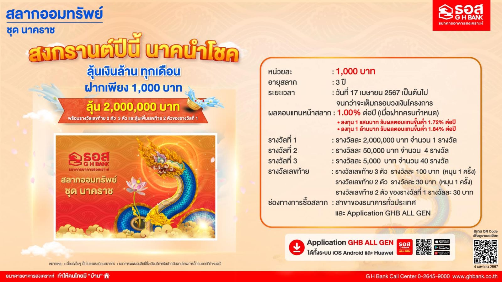 ธนาคารอาคารสงเคราะห์ เปิดตัว สลากออมทรัพย์ ชุด “นาคราช” หน่วยละ 1,000 บาท อายุสลาก 3 ปี ผลตอบแทนหน้าสลากสูงถึง 1.00% ต่อปี ลุ้นรับเงินรางวัลมูลค่า 2 ล้านบาท ตลอด 36 งวด เริ่มรับฝากตั้งแต่วันที่ 17 เมษายน 2567 และออกรางวัลครั้งแรก วันที่ 16 พฤษภาคม 2567 จำหน่ายผ่านช่องทาง Mobile Application : GHB ALL GEN และ ธอส. ทุกสาขาทั่วประเทศ