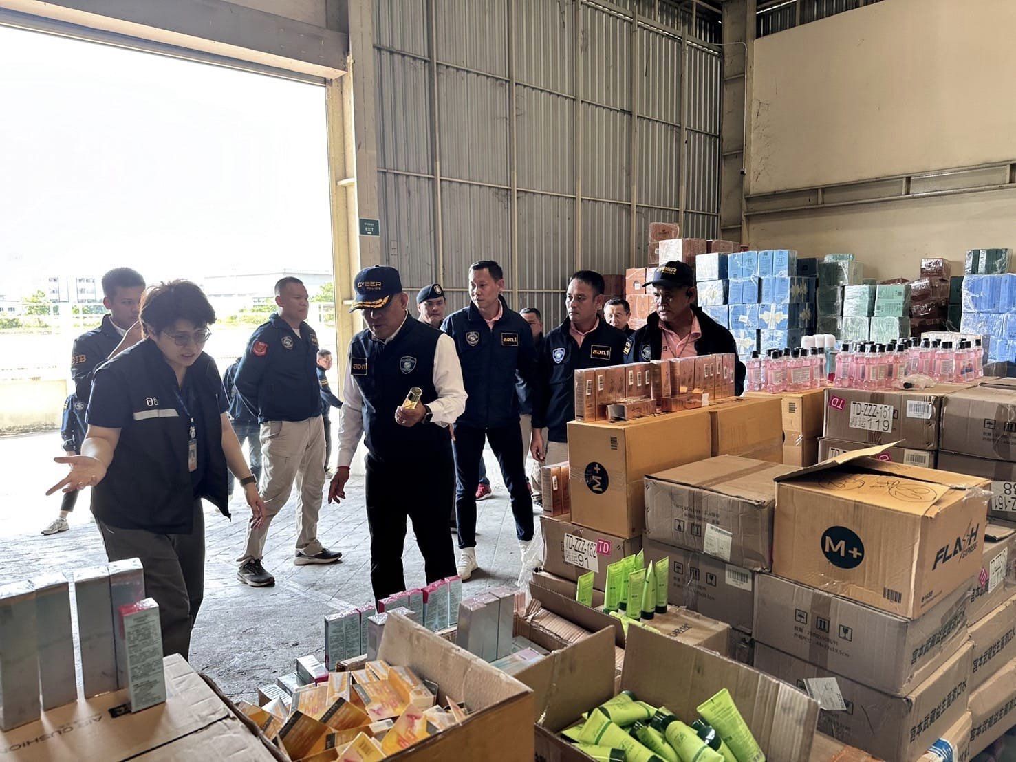 ในวันที่ 2 เมษายน 2567 เวลาประมาณ 10.30 น. เจ้าหน้าที่ตำรวจชุดตรวจค้น พร้อมกำลังเจ้าหน้าที่สำนักงานคณะกรรมการอาหารและยา (อย.) ลงพื้นที่คลังสินค้าแห่งหนึ่ง ในซอยที่ดินไทย ถนนเทพารักษ์ ตำบลบางพลีใหญ่ อำเภอบางพลี จังหวัดสมุทรปราการ ผลการตรวจค้น 2 จุด ตรวจยึดผลิตภัณฑ์เครื่องสำอาง รวมทั้งสิ้น 4,491 ชิ้น มูลค่ากว่าล้านบาท