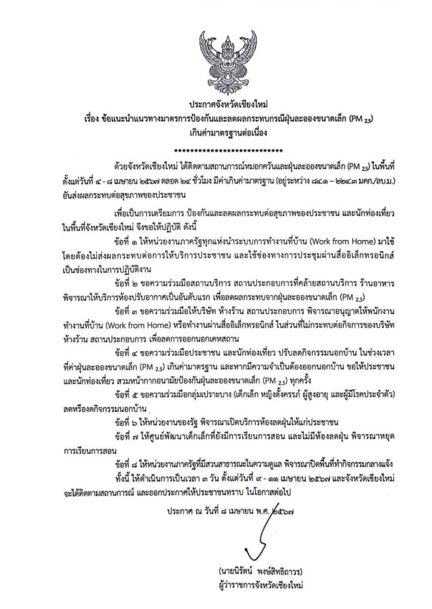 ทั้งนี้ให้ดำเนินการเป็นเวลา 3 วันตั้งแต่วันที่ 9 - 11 เมษายน 2567 และจังหวัดเชียงใหม่ จะได้ติดตามสถานการณ์และออกประกาศให้ประชาชนทราบในโอกาสต่อไป