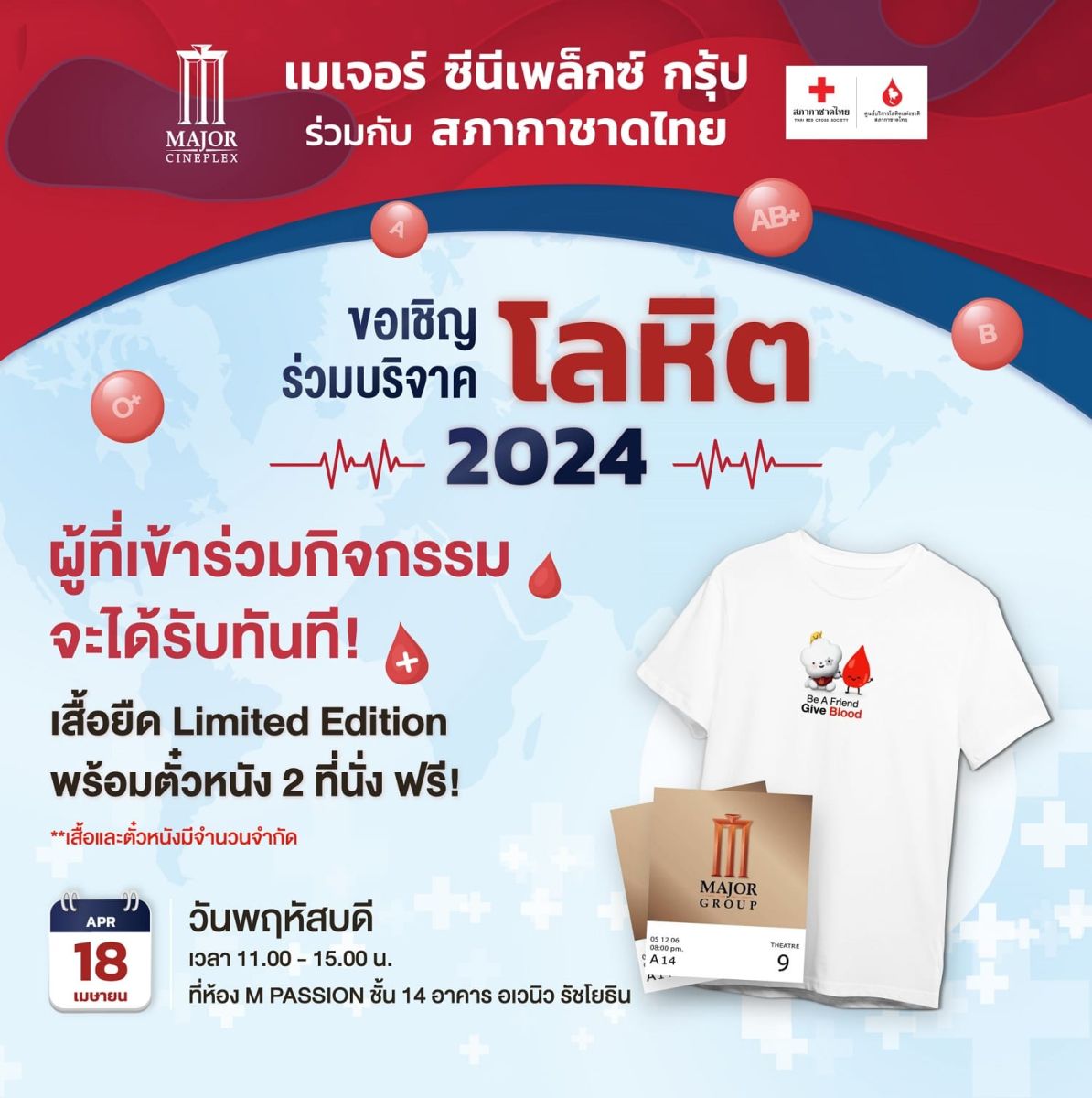 สามารถร่วมบริจาคโลหิตได้ในวันที่ 18 เมษายน 2567 ตั้งแต่เวลา 11.00 - 15.00 น. ณ ห้อง M Passion ชั้น 14 อาคารอเวนิว เมเจอร์ ซีนีเพล็กซ์ รัชโยธิน พร้อมรับของขวัญพิเศษแทนคำขอบคุณเมื่อร่วมบริจาคโลหิต รับฟรี! ตั๋วหนัง 2 ที่นั่ง และ เสื้อยืด Limited Edition “Be A Friend Give Blood” 1 ตัว