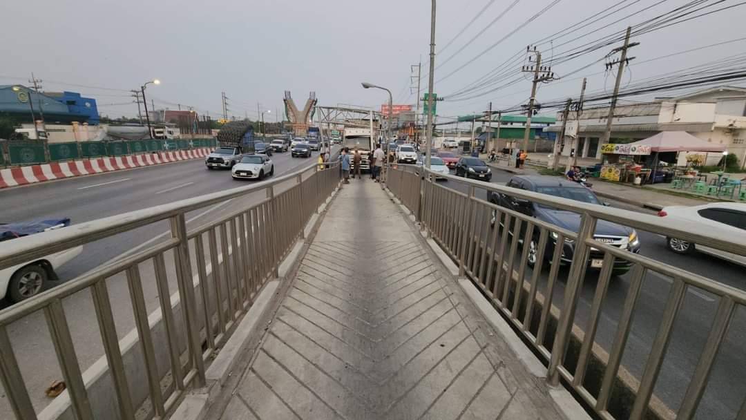 หนุ่มใหญ่ขับรถบรรทุก ชนเสาป้ายสัญญาณสะพานกลับรถ ถนนพระราม 2 คนขับเผยไม่ทันมองป้ายว่า กลับรถเฉพาะรถจักรยานยนต์ จ.สมุทรสาคร
