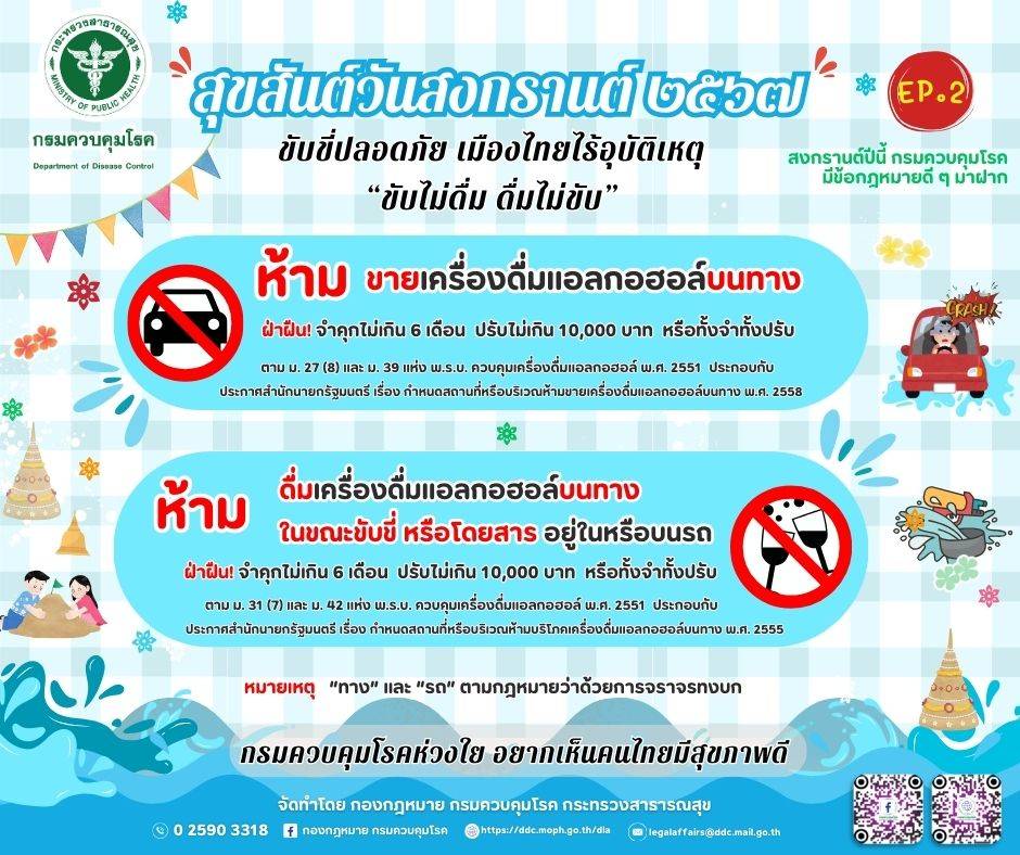 กรมควบคุมโรค ขอส่งความห่วงใย อยากเห็นคนไทยเดินทางปลอดภัยและมีสุขภาพดี จึงขอให้ผู้ที่ดื่มเครื่องดื่มแอลกอฮอล์ ไม่ขับขี่ยานพาหนะด้วยตนเอง พร้อมมอบหมายให้สำนักงานป้องกันควบคุมโรค (สคร.) ทั้ง 12 เขต สุ่มตรวจการกระทำผิดกฎหมาย ทั้งการขายสุราในสถานที่ห้ามขาย สำรวจร้านค้าในชุมชนที่ขายสุราในเวลาห้ามขาย และให้หน่วยงานในสังกัดกรมควบคุมโรคจัดทีมเจ้าหน้าที่ออกตรวจเตือน/ตรวจจับผู้กระทำผิดกฎหมาย โดยเฉพาะกรณีพบผู้บาดเจ็บหรือเสียชีวิตจากอุบัติเหตุทางถนนที่มีอายุต่ำกว่า 20 ปี และมีการดื่มสุรา จะส่งข้อมูลให้กับเจ้าหน้าที่ตำรวจทำการสอบสวนและดำเนินคดีไปถึงผู้ขาย หากประชาชนพบเห็นผู้กระทำผิดกฎหมาย ให้โทรศัพท์แจ้งศูนย์รับเรื่องร้องเรียนบุหรี่และสุรา โทร. 0-2590-3342 หรือสายด่วนกรมควบคุมโรค 1422 ตลอด 24 ชั่วโมง