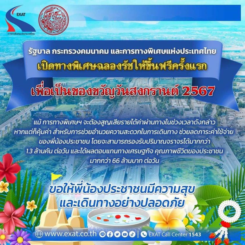 โดยปีนี้พิเศษสุด ที่รัฐบาลภายใต้การนำของท่านนายก เศรษฐา ทวีสิน และกระทรวงคมนาคม สั่งการให้การทางพิเศษฯ ยกเว้นค่าผ่านทาง ของทางพิเศษฉลองรัช หรือทางด่วนรามอินทรา - อาจณรงค์ ที่เชื่อมต่อกับมอเตอร์เวย์สาย 9 ให้ยกเว้นค่าผ่านทางในช่วงเทศกาลสงกรานต์ปีนี้ด้วย