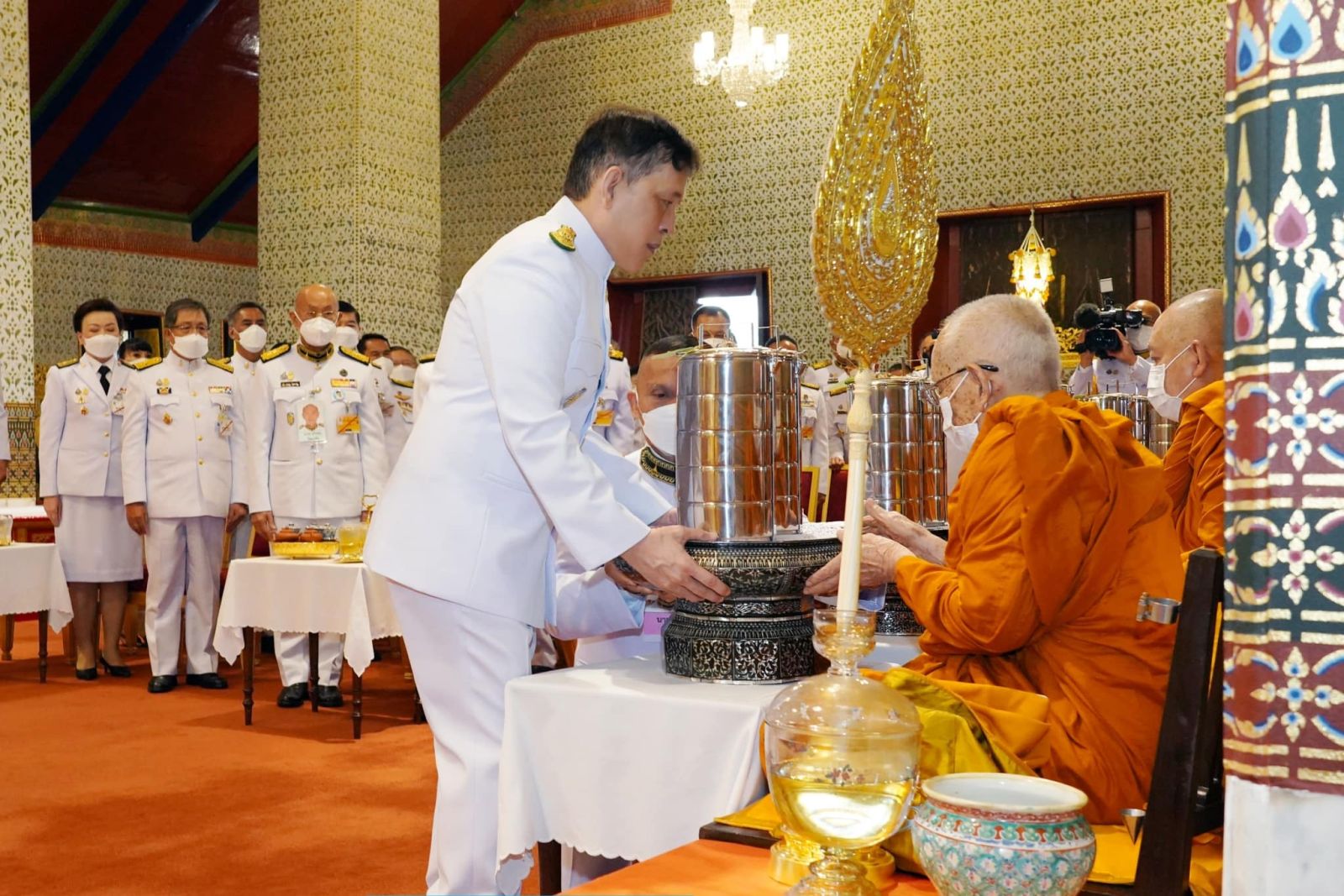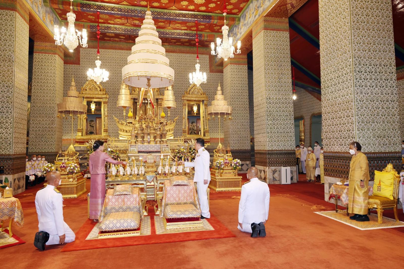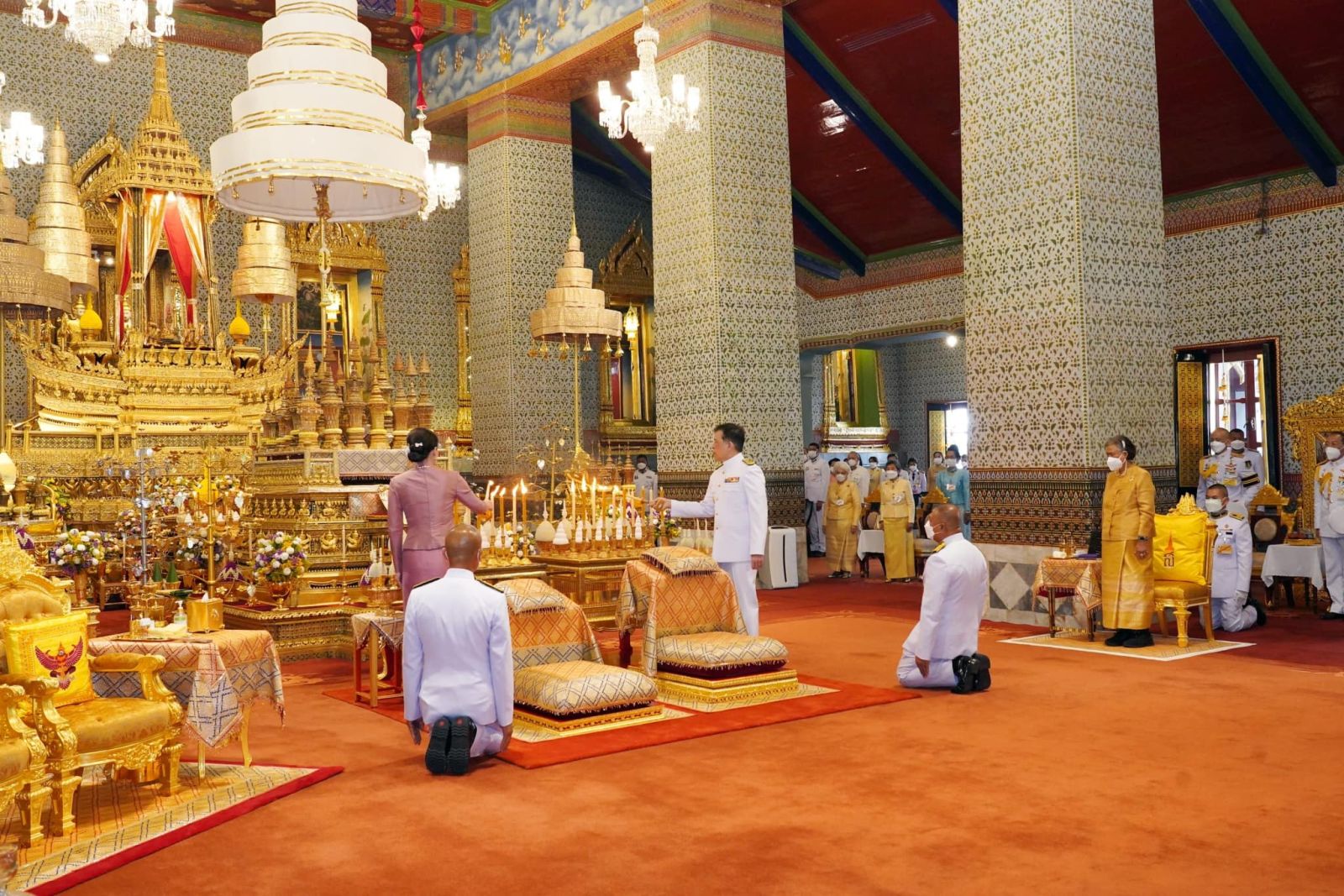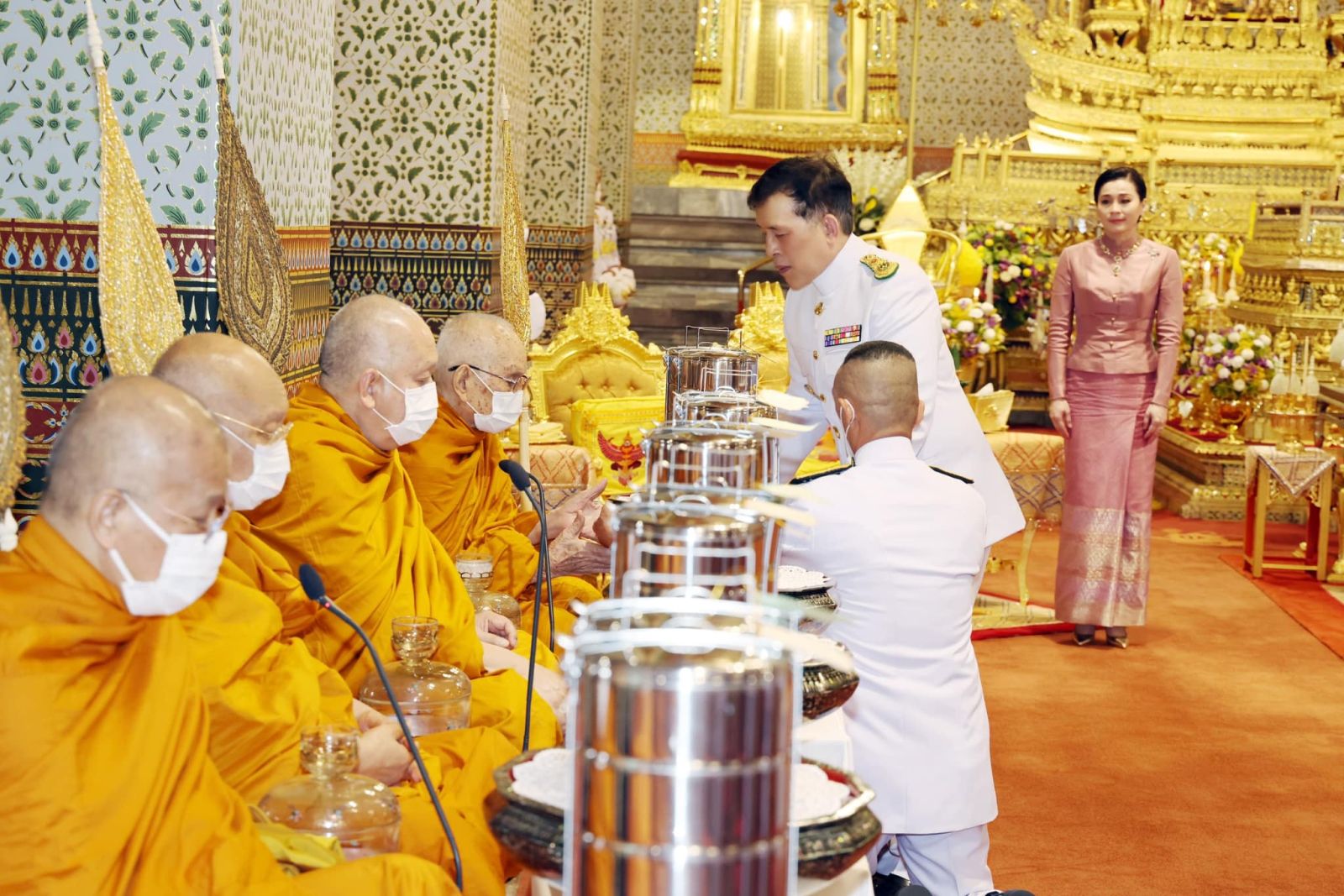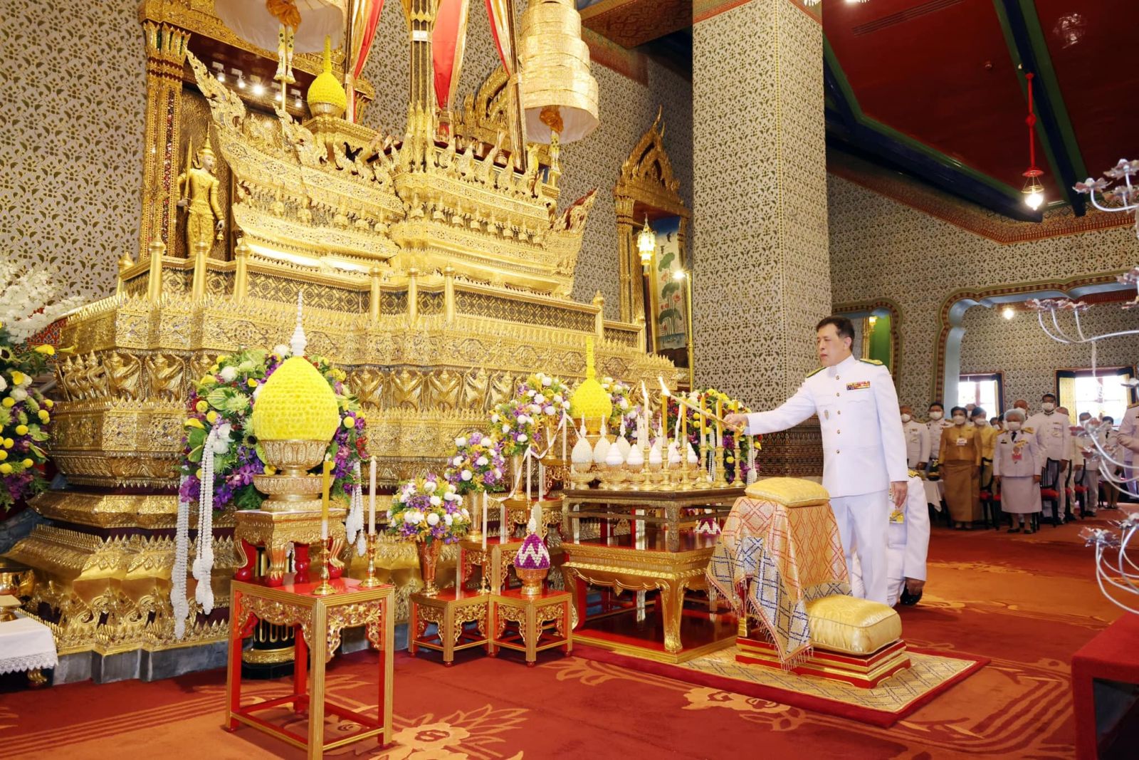 เมื่อเสด็จพระราชดำเนินถึงหอพระสุราลัยพิมาน พระบาทสมเด็จพระเจ้าอยู่หัว ทรงพระสุหร่าย สรงพระพุทธรูปสำคัญต่าง ๆ ทรงจุดธูปเทียนเครื่องนมัสการทองทิศ และทรงสรงพระบรมสารีริกธาตุ จากนั้น เสด็จพระราชดำเนินไปยังพระที่นั่งไพศาลทักษิณ ทรงจุดธูปเทียนเครื่องนมัสการท้ายที่นั่งบูชาพระสยามเทวาธิราช ทรงกราบ แล้วเสด็จพระราชดำเนินไปยังหอพระธาตุมณเฑียร ทรงจุดธูปเทียนเครื่องนมัสการทองทิศถวายราชสักการะ ทรงกราบถวายบังคมพระบรมอัฐิ และพระอัฐิ ทรงสรงน้ำพระบรมอัฐิ และพระอัฐิ ทั่วทุกพระโกศ ทรงกราบที่พระแท่นหน้าเครื่องราชสักการะ เสร็จแล้ว เสด็จพระราชดำเนินไปยังพระที่นั่งอมรินทรวินิจฉัย ทรงจุดธูปเทียนเครื่องนมัสการพานทองสองชั้นบูชาพระพุทธรูปประจำพระชนมวาร รัชกาลที่ ๑ - รัชกาลที่ ๙ ที่หน้าพระที่นั่งบุษบกมาลา ทรงกราบ พระสงฆ์ถวายศีลและถวายพรพระ จบแล้ว เสด็จพระราชดำเนินไปทรงจุดธูปเทียนที่พนมข้าวบิณฑ์หน้าพระที่นั่งบุษบกมาลา แล้วเสด็จพระราชดำเนินไปทรงประเคนปิ่นโตภัตตาหารแด่ประธานสงฆ์ ปิ่นโตภัตตาหารนอกนั้น ทรงพระกรุณาโปรดเกล้าโปรดกระหม่อมให้พระราชวงศ์ องคมนตรี และข้าราชการชั้นผู้ใหญ่ ทรงประเคน และประเคนพระสงฆ์รูปต่อไปตามลำดับ เสร็จแล้ว เจ้าพนักงานเชิญพระโกศพระบรมอัฐิ และพระโกศพระอัฐิ ออกประดิษฐานบนพระราชบัลลังก์ภายใต้พระนพปฎลมหาเศวตฉัตร และบนพระที่นั่งกง พระสงฆ์สดับปกรณ์ พระบาทสมเด็จพระเจ้าอยู่หัว ทรงจุดธูปเทียนเครื่องราชสักการะทองลงยาราชาวดี และทรงจุดธูปเทียนเครื่องทองน้อยที่หน้าพระแท่นพระนพปฎลมหาเศวตฉัตร ทรงกราบ ถวายบังคมพระบรมอัฐิ และพระอัฐิ สมเด็จพระนางเจ้า ฯ พระบรมราชินี ทรงจุดธูปเทียนเครื่องราชสักการะทองลงยารอง และทรงจุดธูปเทียนเครื่องทองน้อยที่หน้าพระแท่นพระนพปฎลมหาเศวตฉัตร ทรงกราบถวายบังคมพระบรมอัฐิ และพระอัฐิ แล้วเสด็จพระราชดำเนินไปทรงทอดผ้าคู่ถวายพระสงฆ์ จำนวน ๔ เที่ยว เที่ยวละ ๑๘ รูป พระสงฆ์สดับปกรณ์ ทรงหลั่งทักษิโณทก พระสงฆ์ถวายอนุโมทนา ถวายอดิเรก ถวายพระพรลา จากนั้น เสด็จพระราชดำเนินไปทรงกราบพระพุทธรูปประจำพระชนมวาร รัชกาลที่ ๑ – รัชกาลที่ ๙ ที่หน้าพระที่นั่งบุษบกมาลา ทรงกราบพระบรมอัฐิ และพระอัฐิที่หน้าพระแท่นพระนพปฎลมหาเศวตฉัตร ทรงรับการถวายความเคารพของผู้มาเฝ้าทูลละอองธุลีพระบาท แล้วเสด็จออกจากพระที่นั่งอมรินทรวินิจฉัย ประทับรถยนต์พระที่นั่ง เสด็จพระราชดำเนินกลับ