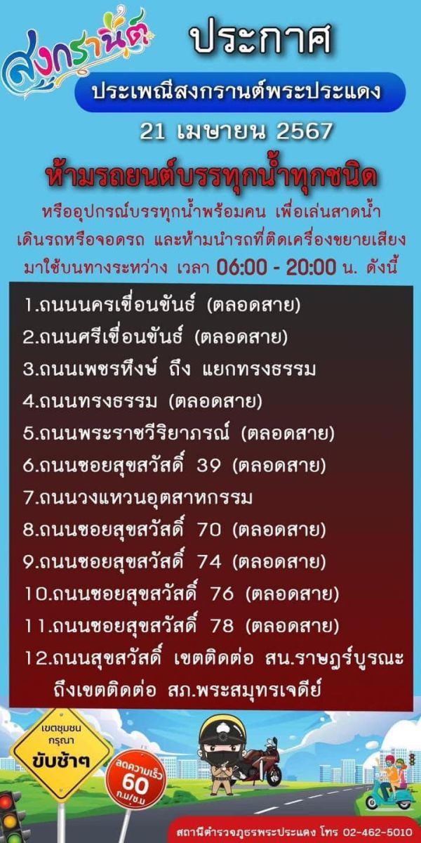 สถานีตำรวจภูธรพระประแดง สมุทรปราการ ออกประกาศ ข้อห้าม ข้อควรปฏิบัติ สงกรานต์พระประแดง 21 เม.ย. 2567 โดยระบุว่า ด้วยปัจจุบันบนถนนสุขสวัสดิ์ มีการก่อสร้างรถไฟรถไฟฟ้าสายสีม่วง จึงทำให้พื้นผิวการจราจรแคบลงเกิดปัญหาการจราจรติดขัด และสร้างความเดือดร้อนให้กับประชาชน ผู้ใช้รถใช้ถนน และพักอาศัยอยู่บริเวณถนนสุขสวัสดิ์เป็นวงกว้าง ทางตำรวจภูธรจังหวัดสมุทรปราการ จึงได้ออก ข้อบังคับ ห้ามรถยนต์บรรทุกน้ำทุกชนิด หรืออุปกรณ์บรรทุกน้ำพร้อมคน เพื่อเล่นสาดน้ำ เดินรถหรือจอดรถ และห้ามนำรถที่ติดเครื่องขยายเสียง มาใช้บนทางระหว่าง เวลา 06:00 – 20:00 น. ดังนี้