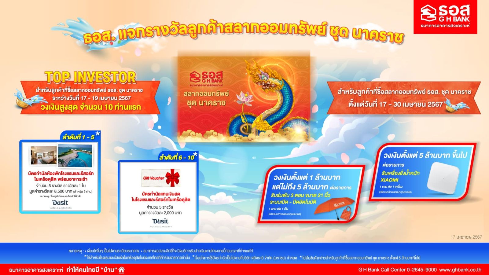 ธนาคารอาคารสงเคราะห์ (ธอส.) จัดโปรโมชันตอบแทนผู้ซื้อสลากออมทรัพย์ ธอส. ชุดนาคราช หน่วยละ 1,000 บาท ที่นอกจากจะได้รับผลตอบแทนหน้าสลากสูงถึง 1.00% ต่อปี (ซื้อสลาก 1 แสนบาท รับผลตอบแทนขั้นต่ำ 1.72% ต่อปี และซื้อสลาก 1 ล้านบาท รับผลตอบแทนขั้นต่ำ 1.84% ต่อปี) ยังมีโอกาสถูกรางวัลที่ 1 มูลค่ารางวัลสูงถึง 2 ล้านบาท พร้อมลุ้นรางวัลเลขท้าย 2 ตัว 3 ตัว และรางวัลเลขท้าย 2 ตัวของรางวัลที่ 1 ให้ได้ลุ้นเพิ่ม ตลอด 36 ครั้ง การันตี! ซื้อสลากเพียง 1 แสนบาท ถูกรางวัลเลขท้าย 2 ตัว และเลขท้าย 2 ตัว ของรางวัลที่ 1 ทุกงวด รวมถึงยังมีโอกาสรับของสมนาคุณพิเศษ 2 ต่อจาก ธอส. พิเศษต่อที่ 1 สำหรับลูกค้าที่ซื้อสลากระหว่างวันที่ 17- 19 เม.ย. 2567 ตั้งแต่ 5 ล้านบาทขึ้นไป วงเงินสูงสุดลำดับที่ 1 – 5 จะได้รับบัตรกำนัลห้องพักโรงแรมและรีสอร์ทในเครือดุสิต 1 คืน พร้อมอาหารเช้าสำหรับ 2 ท่าน จำนวน 5 รางวัลๆ ละ 1 ใบ มูลค่ารางวัลละ 8,500 บาท และวงเงินสูงสุดลำดับที่ 6 – 10 จะได้รับบัตรกำนัลแทนเงินสดสำหรับใช้บริการในโรงแรมและรีสอร์ทในเครือดุสิต จำนวน 5 รางวัล มูลค่ารางวัลละ 2,000 บาทและ พิเศษต่อที่ 2 สำหรับลูกค้าที่ซื้อสลากตั้งแต่วันที่ 17- 30 เม.ย. 2567 วงเงินตั้งแต่ 1 ล้านบาท แต่ไม่ถึง 5 ล้านบาทต่อรายการ รับฟรีร่มพับ 3 ตอน ขนาด 21 นิ้ว จำนวน 1 รายต่อ 1 คัน และซื้อวงเงิน ตั้งแต่ 5 ล้านบาทขึ้นไปต่อรายการ รับฟรีเครื่องชั่งน้ำหนัก Xiaomi จำนวน 1 ท่านต่อ 1 เครื่อง ทั้งนี้ ผู้ที่สนใจสามารถซื้อสลากออมทรัพย์ ชุดนาคราช ได้ที่ Mobile Application : GHB ALL GEN หรือที่สาขา ธอส.ทั่วประเทศ ได้ตั้งแต่วันนี้เป็นต้นไป หรือจนกว่าจะเต็มกรอบวงเงิน โดยจะเริ่มออกรางวัลครั้งแรกวันพฤหัสบดีที่ 16 พฤษภาคม 2567 สอบถามรายละเอียดเพิ่มเติมได้ที่ ธอส. ทุกสาขาทั่วประเทศ หรือ G H Bank Call Center โทร 0-2645-9000 หรือ Facebook Fanpage ธนาคารอาคารสงเคราะห์ และ ติดตามข้อมูลข่าวสารได้ที่ Application : GHB ALL GEN และ www.ghbank.co.th