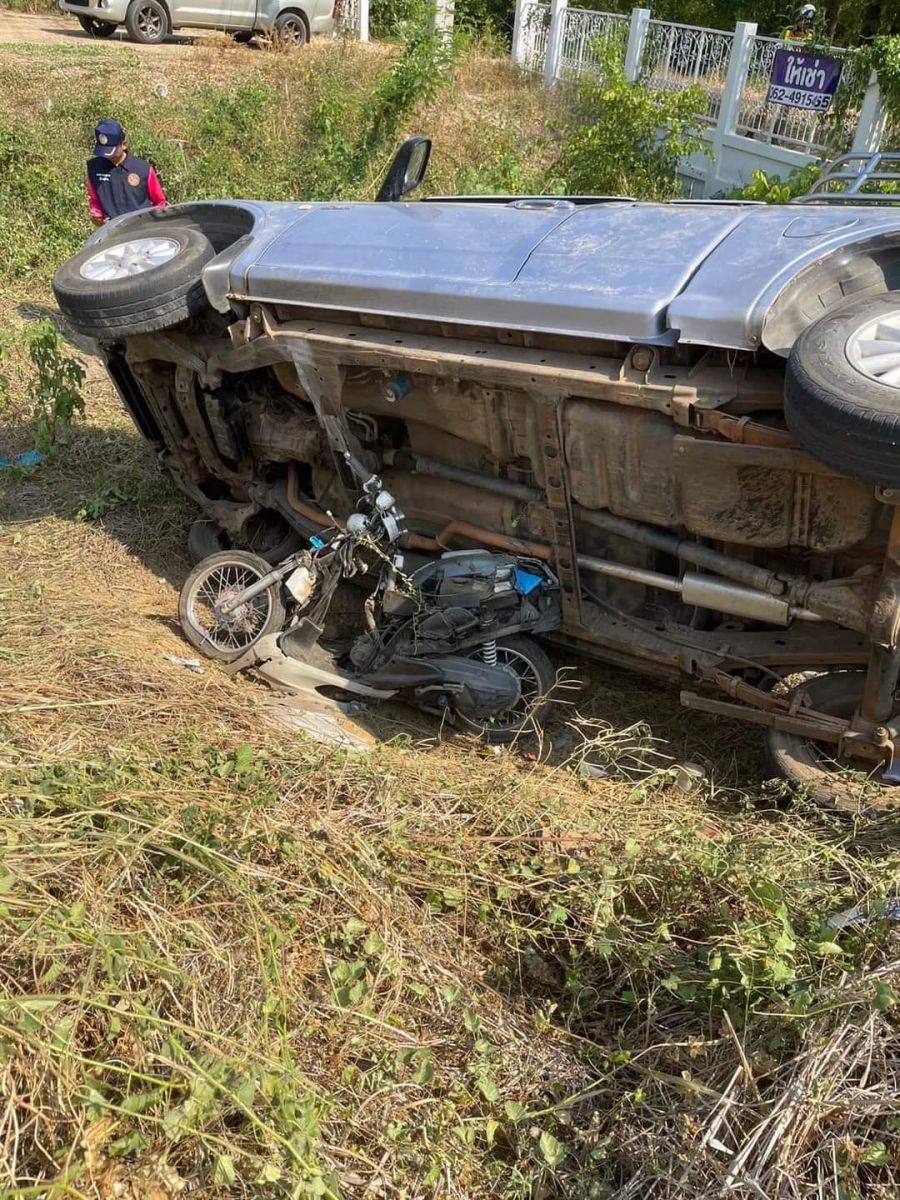 ที่เกิดเหตุ บริเวณคูข้างทาง พบรถกระบะ อีซูซุ ดีแม็กซ์ สีเทา ลักษณะพลิกตะแคง ใกล้กันพบรถจักรยานยนต์ ยามาฮ่า ฟีโน่ สีน้ำเงิน - ดำ อยู่ใต้ท้องรถกระบะสภาพพังเสียหาย และพบว่ามีผู้เสียชีวิต เป็นผู้หญิง 1 คน ในส่วนของสาเหตุอยู่ระหว่างการสอบสวนของเจ้าหน้าที่ตำรวจ สภ.เมืองกาญจนบุรี