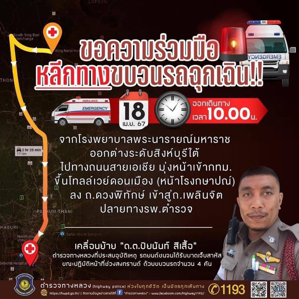 วันนี้ (18 เม.ย.2567) ผู้สื่อข่าวรายงานความคืบหน้ากรณีอุบัติเหตุชน ด.ต.ปิยนันท์ สีเสื้อ ตำรวจทางหลวงระหว่างปฏิบัติหน้าที่อำนวยความสะดวกด้านจราจรช่วงสงกรานต์ ที่ลพบุรี อาการสาหัส โดยในช่วงเช้าวันนี้เวลา 10.00 น.โรงพยาบาลตำรวจจะนำรถพยาบาลมารับตัวดต.ปิยนันท์ เพื่อไปรักษาต่อ โดยมีขบวนรถ 4 คัน เดินทางจากโรงพยาบาลพระนารายณ์มหาราช มุ่งหน้าถนนเอเชีย ถนนพหลโยธิน และทางด่วนดอนเมือง ไปลงที่โรงพยาบาลตำรวจ คาดว่า ใช้เวลาไม่เกิน 2 ชั่วโมง จึงขอความร่วมมือผู้ใช้รถใช้ถนนช่วยหลบทางให้รถพยาบาลตลอดเส้นทาง เพื่อให้เดินทางถึงเป้าหมายได้โดยเร็ว