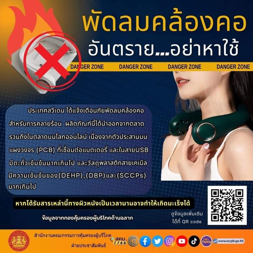 วันที่ 19 เม.ย. 2567 เพจ กองคุ้มครองผู้บริโภคด้านธุรกิจขายตรงและตลาดแบบตรง สคบ.โพสต์ภาพพร้อมข้อความแจ้งเตือนผู้บริโภค รายละเอียด ระบุว่า พัดลมคล้องคอ อันตราย อย่าหาใช้