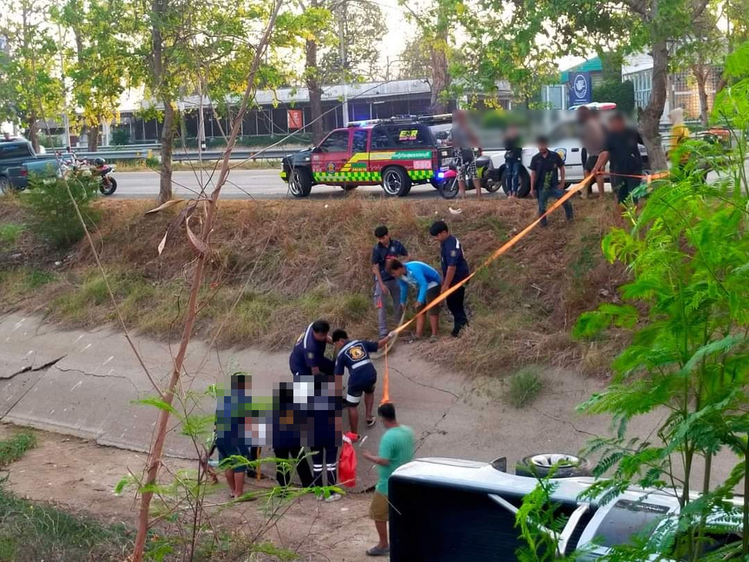 รถกระบะเสียหลักตกข้างทาง พลิกตะแคงในร่องน้ำคลองชลประทานที่ไม่ได้น้ำ ริมถนนทางหลวงหมายเลข 340 พบผู้บาดเจ็บและเสียชีวิต จ.สุพรรณบุรี