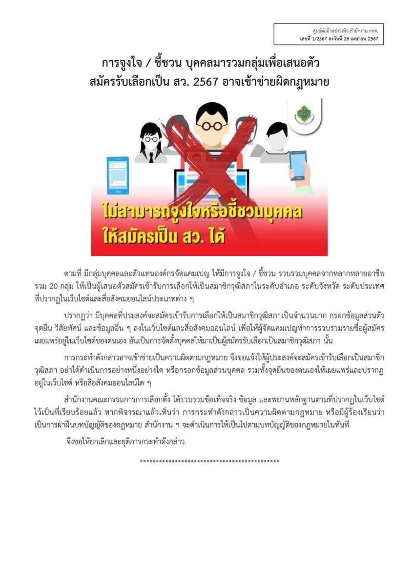สำนักงานคณะกรรมการการเลือกตั้งเผยแพร่ข้อมูล กรณีที่ มีกลุ่มบุคคลและตัวแทนองค์กรจัดแคมเปญ ให้มีการจูงใจ ชี้ชวน รวบรวมบุคคลจากหลากหลายอาชีพ รวม 20 กลุ่ม ให้เป็นผู้เสนอตัวสมัครเข้ารับการเลือกให้เป็นสมาชิกวุฒิสภาในระดับอำเภอ ระดับจังหวัด ระดับประเทศ ที่ปรากฎในเว็บไซต์และสื่อสังคมออนไลน์ประเภทต่าง ๆ